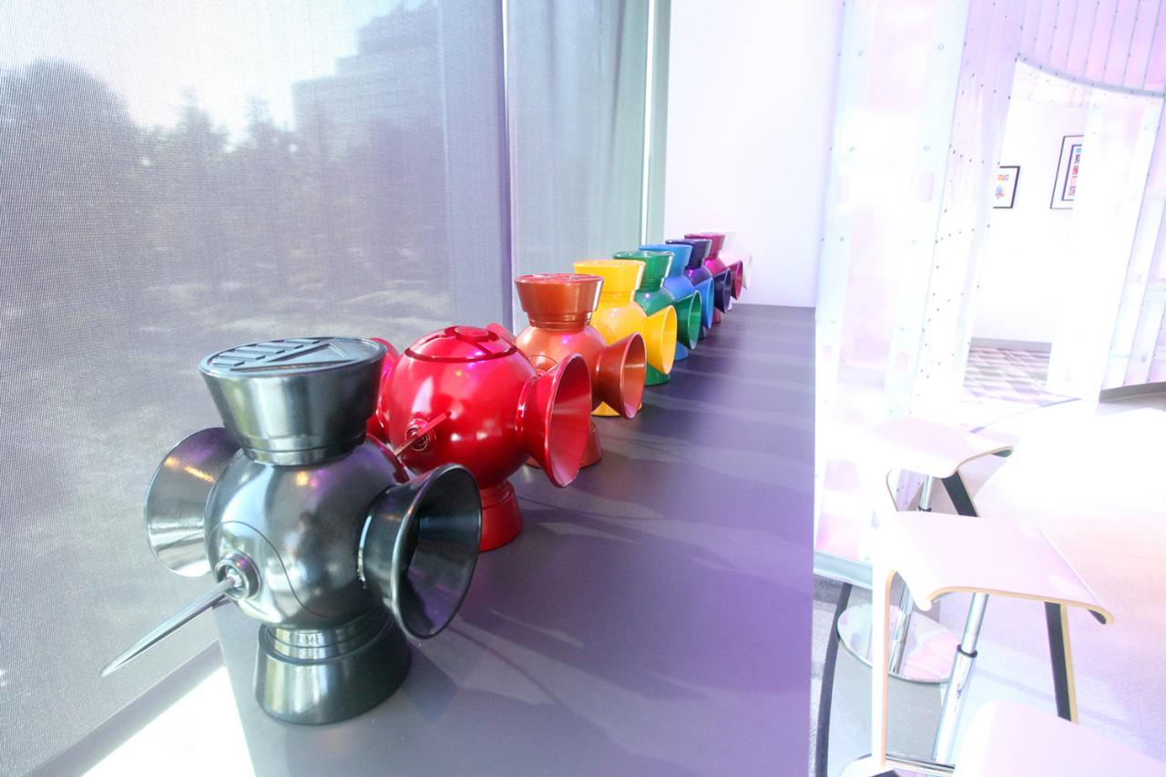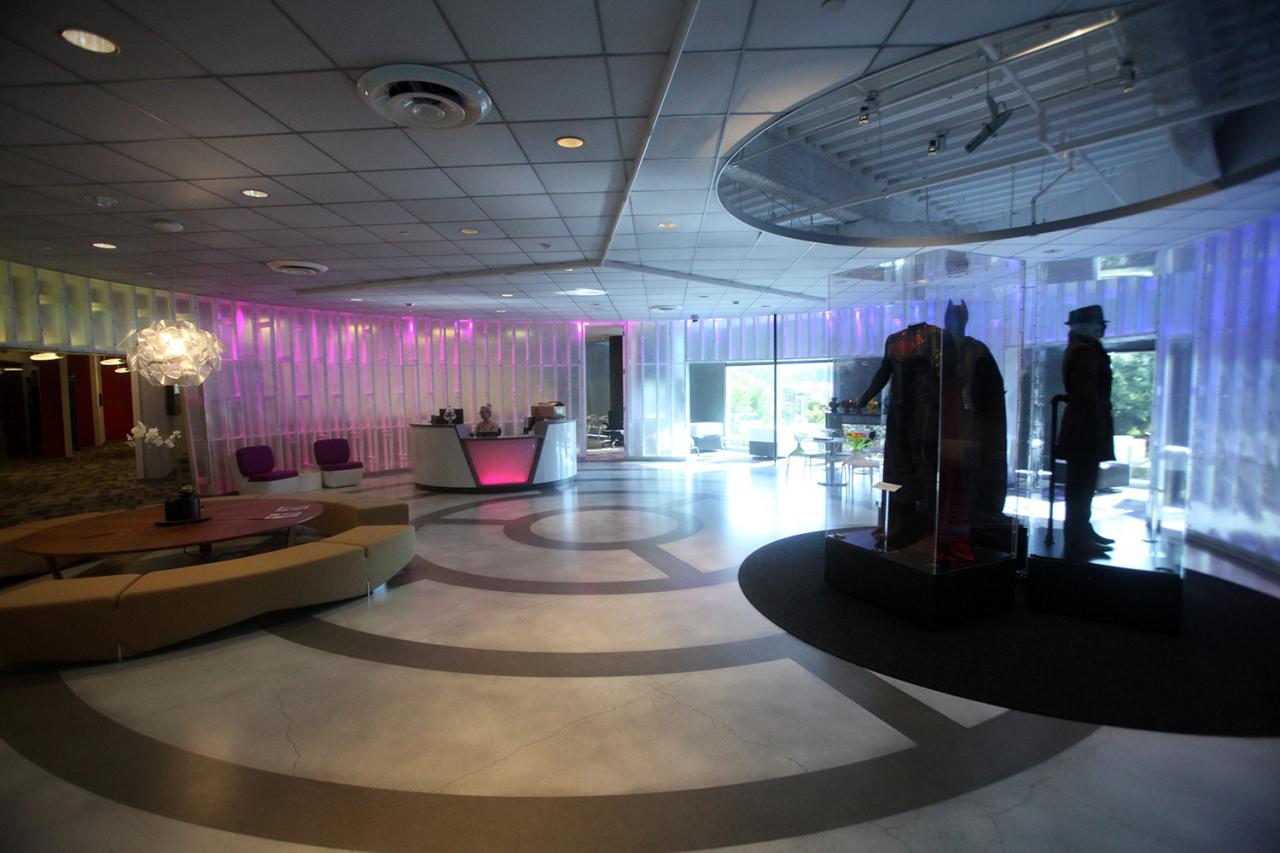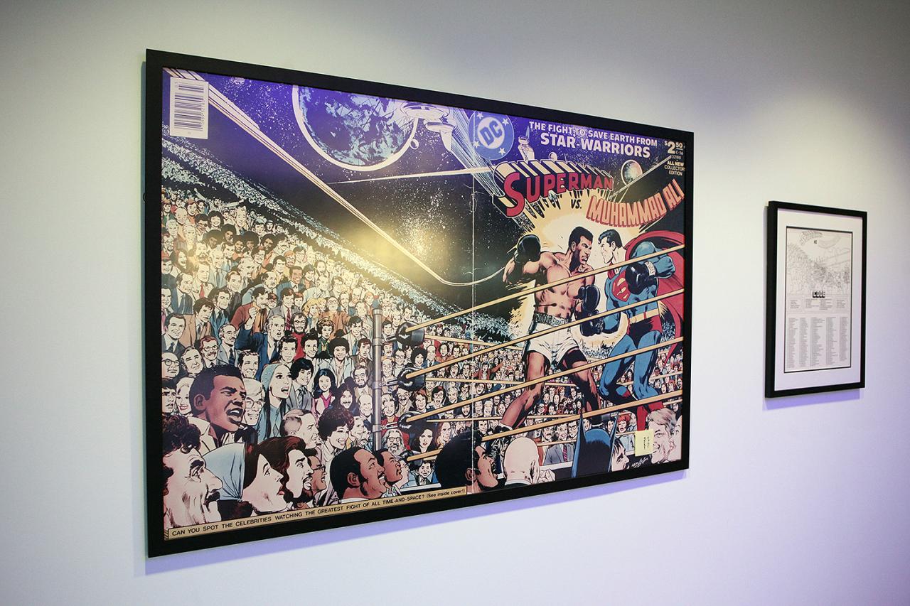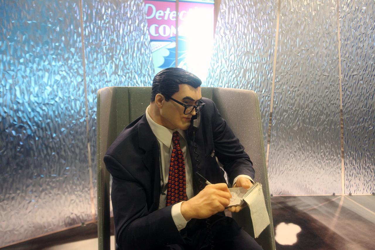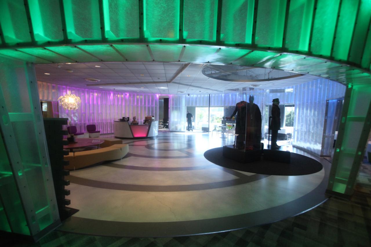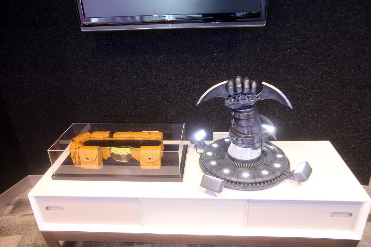 Known as the “Fortress of Solitude,” DC Entertainment’s main lobby space greets visitors with a slew of sights including video monitors showing off cool multimedia, a circular central area with glowing lights that change color, metal frames, and a vast panorama window through which you can see the famous water tower at Warner Bros. studios. Alongside the windows is a full display of Lantern Battery Prop Replicas representing the full emotional spectrum, and nearby is a comfortable alcove featuring a giant chess board populated by Mattel DC Universe Classics figures for pieces! Also on the sidelines of the lobby is a game area with both DC-themed pinball and video games as well as cool artwork and prop replicas. If you’re at the offices to wait you won’t be bored, and you can check out a trio of screen-used costumes of the Man of Steel, Batman, and Rorschach and a Lego wall “tagged” with Batman, a 3D LEGO representation of Jim Lee’s artwork from DCE’s 2012 Darkness & Light exhibit. Nearby, there is a beautiful timeline celebrating DC’s 80-year history (through this year’s Convergence event) that celebrates the company, its characters, and all the milestones achieved at the New York offices.