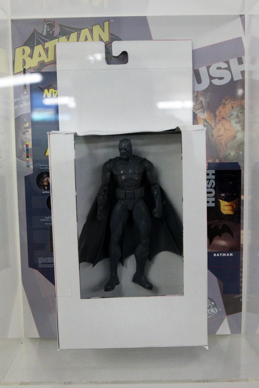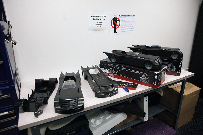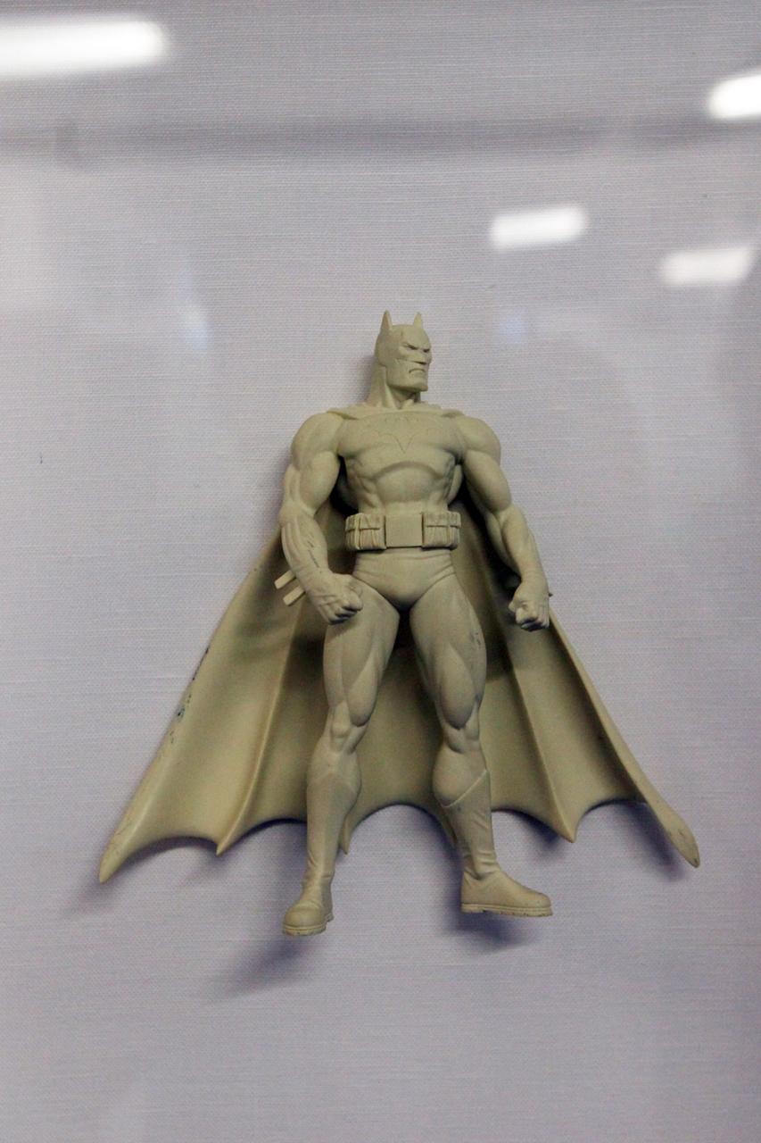 Right at the entrance to the DC Collectibles area is a series of wall-mounted shadowboxes that tell the story of an action figure in production. It uses the iconic Jim Lee Hush Batman figure sculpted by Tim Bruckner to show the evolution of a figure from concept to finished product, with all the steps that many people don’t know. At the beginning is the artwork on which the figure was based followed by a hand-sculpted prototype, the original paint master, replicas of the actual molds used to produce the figure’s parts, sprue trees of the parts from the factory, a packaging mock-up, and at long last the final, production version collectors bought in stores. It’s a fascinating look at the process behind how toys are made, and what goes into each figure. Except for the actual production most of those steps happen in the DC Collectibles office including artwork, examination and approvals of prototypes and paint masters, package design, etc. The entire cycle from concept to shelf is about one year for figures, and a bit shorter for statues (no articulation, different manufacturing processes, smaller runs, etc.). The office even has its own 3D printer to look at physical prototypes of digital sculpts. It takes up to 50 hours to output a large action figure, done in pieces which are then assembled, and with it they can check the look of the figure and note anything that needs to be fixed, scaled up or down, adjustments in tooling, etc. They can even print parts and figures in different materials and qualities for testing purposes; this kind of thing can cut down immensely on prototyping and getting approvals made.