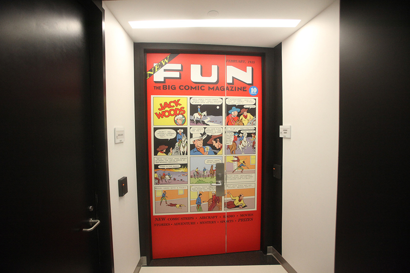 We also got to visit the brand new DC Entertainment Library, just recently moved to the West Coast from New York. The door to this area is decorated by the first ever comic book by the ancestor of DC Comics, New Fun #1 from 1935, and behind it is every comic book lover’s dream: over 90,000 comics from the very beginning all the way to today’s newest releases! They have everything from the earliest books to first appearances, incredibly rare one-off ashcans, special promos and printed advertisements. Current issues go to library too, along with collected trades and one of everything DC releases. Best of all there’s a small display case that holds true icons of comic book history including first appearances and truly unique vintage items like Action Comics #1, an ultra-rare ashcan version of the same, the 1939-1940 New York World’s Fair Comics issue (with a blonde Superman, John Zatara, and the Sandman on the cover!), Supergirl’s first cover appearance, All Star Comics #8, Wonder Woman #1, Whiz Comics #1/2 from 1940, Detective Comics #1 from 1937, and more.