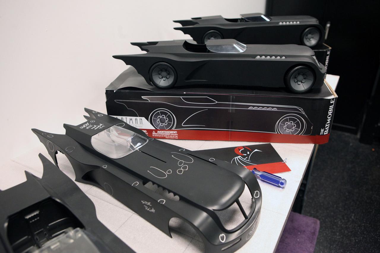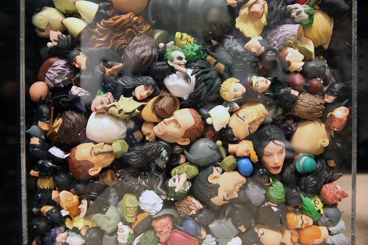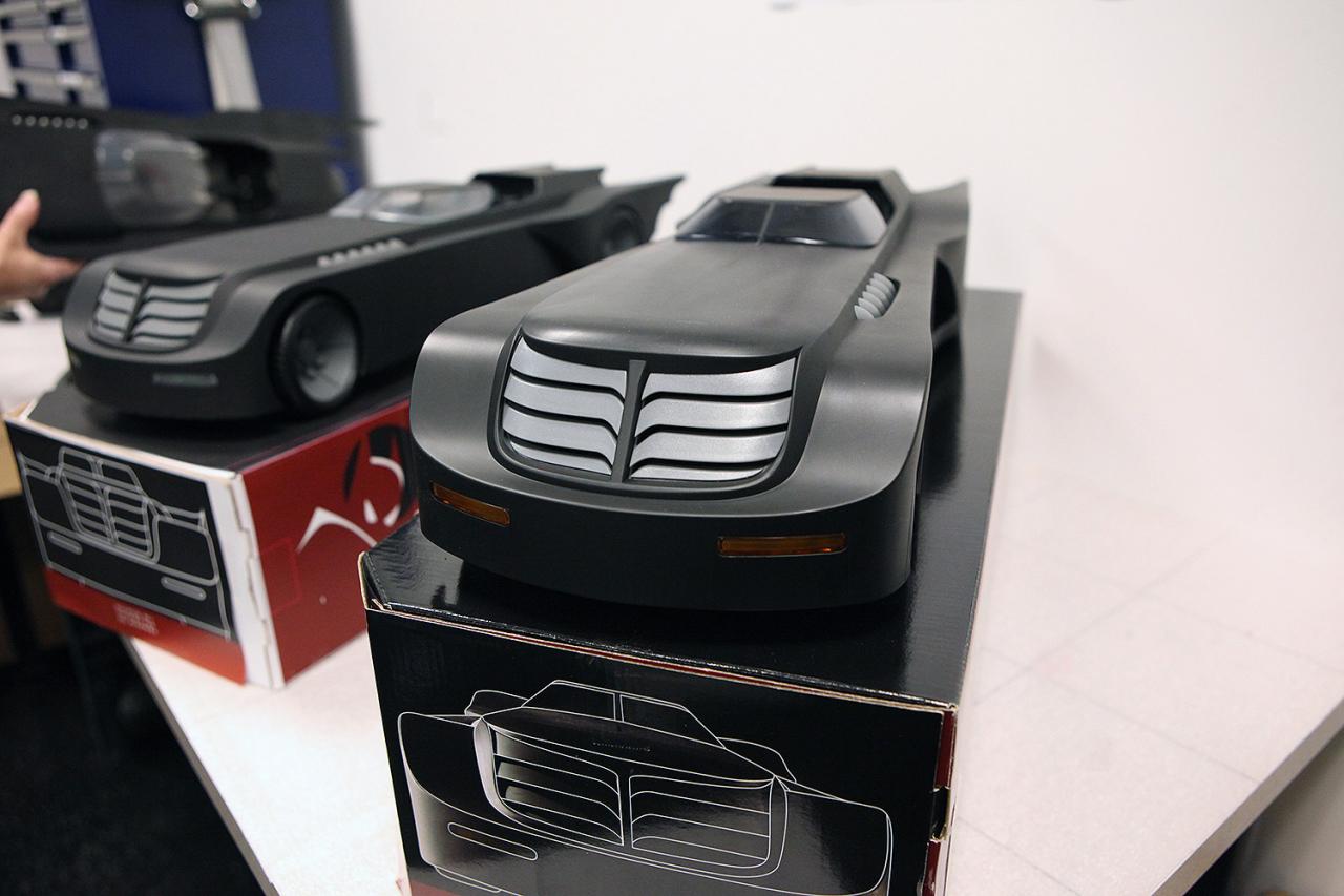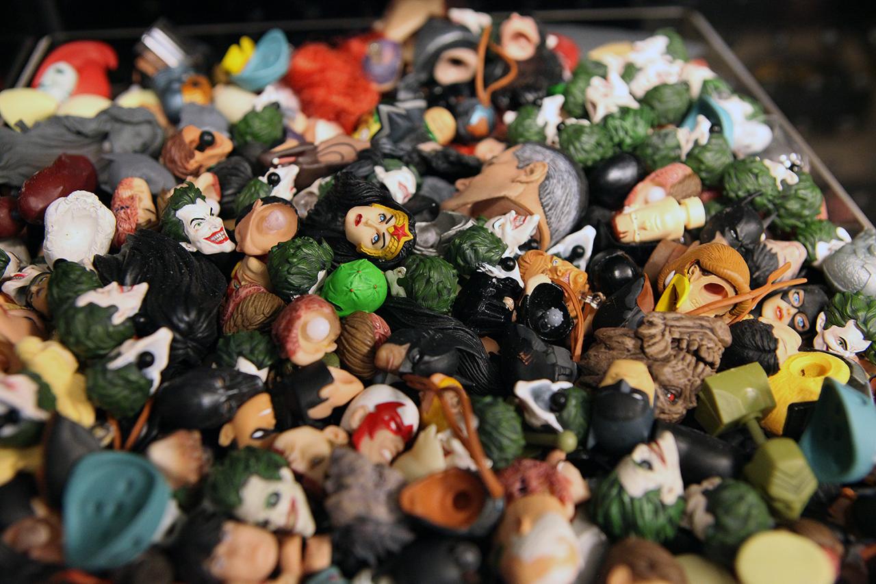 Next up on the tour was the Model Shop, informally called the “Doll Hospital.” This is where the DC Collectibles team does in-house testing and quality control plus all sorts of mad scientist-like experiments on new and future releases. Here they work on mock ups of toys and packaging, examine early samples, and note any defects that require fixing before final products are approved. There were all sorts of items undergoing strenuous testing while we were there including upcoming Icons action figures, Felicity Smoak from TV’s Arrow, Bombshells Harley Quinn and Joker Statue, Batgirl statue, Gotham City Garage Harley Quinn, and the Batman: The Animated Series Batmobile which looked absolutely amazing and huge! Along the way toys do get damaged and destroyed, and the team has amassed quite the collection of action figure heads in a giant box.