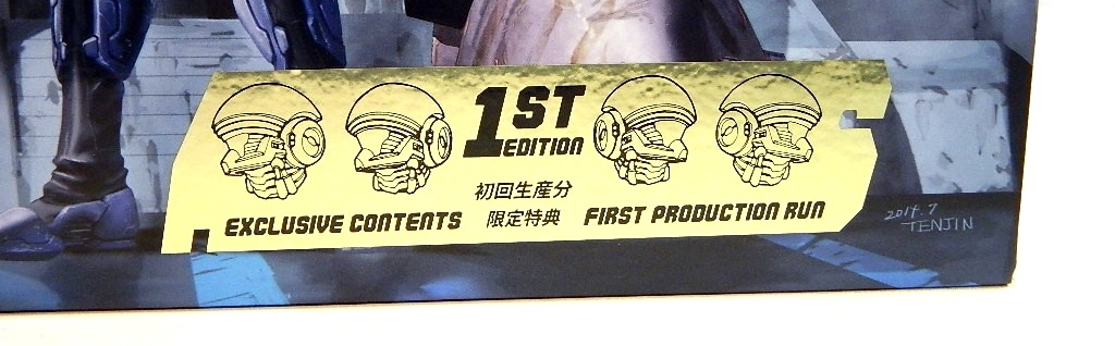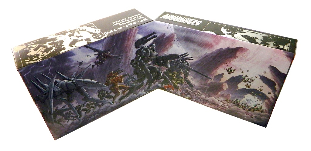 As mentioned in our figure review, this deluxe introductory package marks the first-run of the Bellerophon action figure. For the robot's grand debut, no expense was spared. First off, the box for this beast is huge, measuring a solid 16-inches tall, 12-inches wide and almost 9 inches in thickness. Equally impressive is the material used, a nice and chunky cardboard construction. Jaw-dropping artwork by Hidetaka Tenjin adorns the front, along with all the responsible parties: Production by Mecha Workshop and Manufacturing and Distribution by Sentinel. The bottom right-hand corner features a gold foil sticker that proclaims this figure as being the "First Production Run" and including "Exclusive Contents". This introductory "Deluxe Bundle" includes a docking station decked out in "comic colors," an Armarauders content DVD, exclusive Issue #01 comic book (variant of online version), first-run exclusive alternate clear head dome for the Bellerophon, and two exclusive diorama backgrounds ("The Battalion’s Charge" and "Testudo Mobile Tank Mech Hangar"), which are actually part of this amazing package design. After the initial Deluxe Bundle release, the Bellerophon and docking station will be sold separately, sans all the extra goodies (and super amazing packaging design).