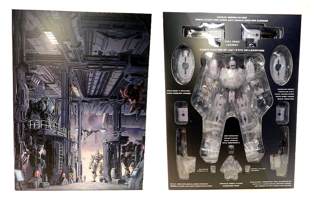 The two box halves are where you'll find your Bellerophon action figure, docking bay and accessories. The Bellerophon box side features a cool cut-out window view of the action figure with call outs to its extensive armament and weaponry. The figure and all its accessories pull out on an inner plastic tray from the top of the box (or is it the side?). The other box contains the docking bay and its components, also stowed on a slide-out plastic tray. However, instead of a window box view of the docking bay, more art work is featured, that being the second diorama backdrop: "Testudo Mobile Tank Mech Hangar". Just spectacular packaging presentation.