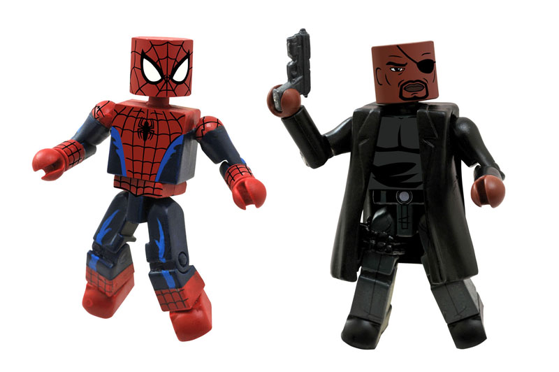The assortment, based on the animated series Marvel’s Ultimate Spider-Man, includes three different two-packs: Spider-Man with Nick Fury, Nova with Carnage, and Stealth Suit Spider-Man with Sandman. Each 2-inch Minimates mini-figure features 14 points of articulation, as well as fully interchangeable parts and accessories. Spider-Man comes with a web line, Nick Fury comes with a pistol, Nova comes with a hairpiece and flight stand, Sandman comes with shape-shifting hands, and Stealth Spider-Man comes with an alternate chest block!