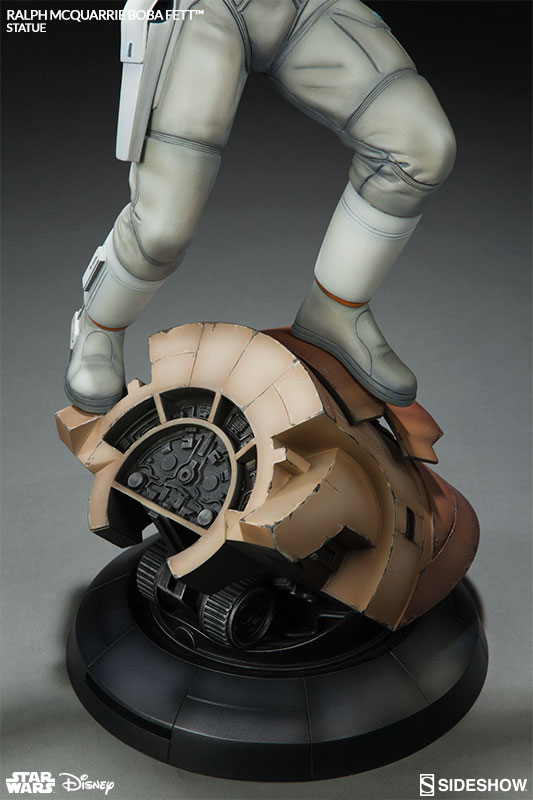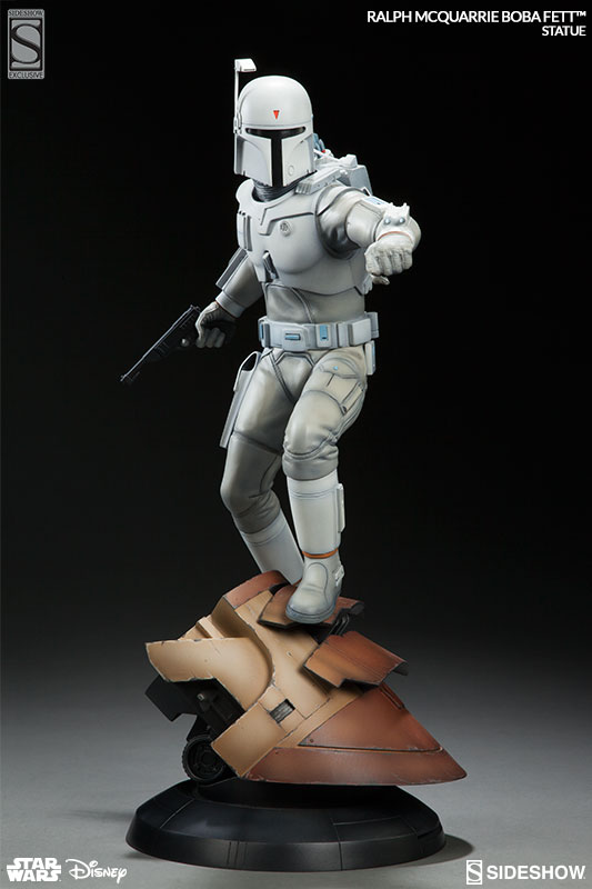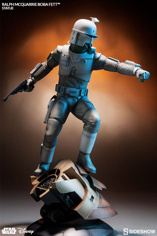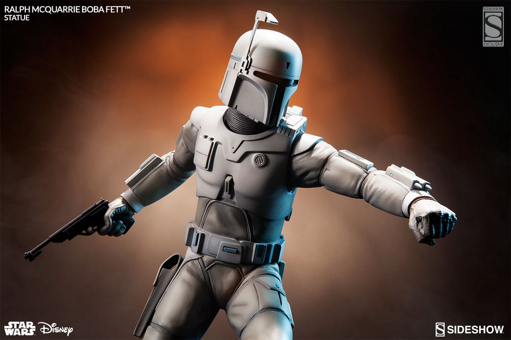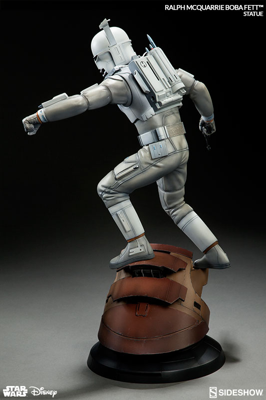 Following their Ralph McQuarrie Stormtrooper Statue (see HERE), Sideshow presents the second piece in their Ralph McQuarrie concept collection: Boba Fett. Inspired by pre-production artwork for Star Wars: The Empire Strikes Back by visionary illustrator Ralph McQuarrie, Boba Fett appears in his original all-white armor, leaping into action over a base inspired by the Slave I.