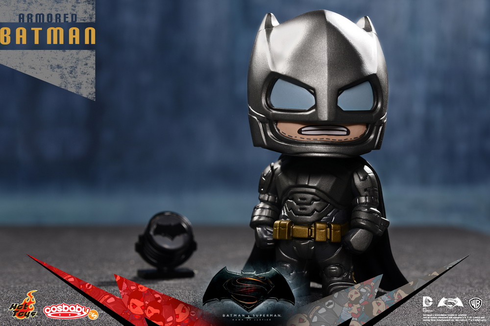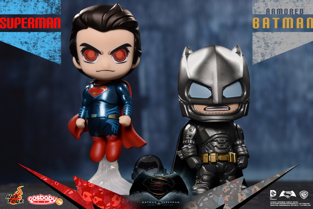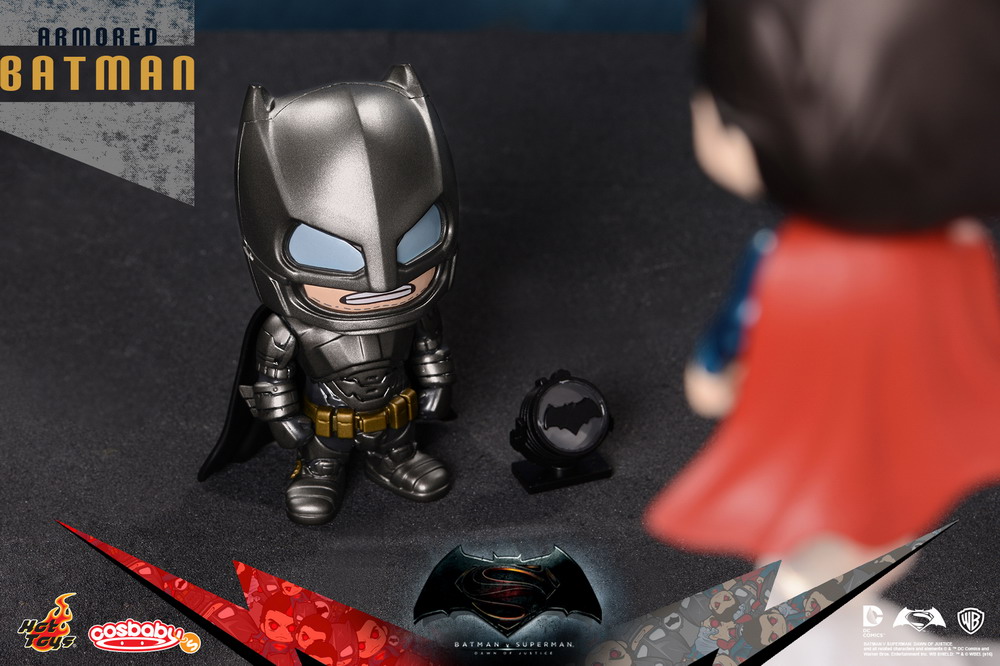 The epic showdown between Batman and Superman will finally come to the silver screen this March in Batman v Superman: Dawn of Justice . In addition to movie-accurate 1:6th scale action figures, Hot Toys will bring to fans collectible Cosbabies of Armored Batman and Superman. Armored Batman stands approximately 3.7 inches tall (9.5cm) while the flying Superman stands approximately 4.9" (12.5cm). Each Cosbaby has rotating head and this collectible set will also exclusively include a miniature Bat-Signal!