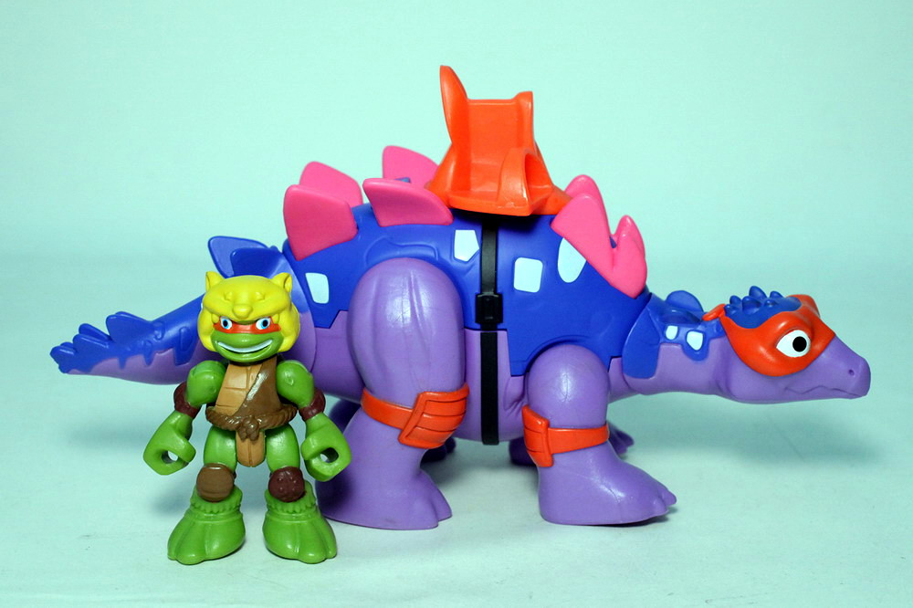 The Stegosaurus (with Mikey) is a colorful purple beast wearing an orange mask. A throne or chair is fixed on top of his back for Mikey to slide his feet into while a button directly behind the seat gives the Stegosaurus a slashing tail and moving head feature. The four legged beast also has articulated arms and legs to aid with the play. Mikey himself is mostly a re-release of a previous Mikey figure, but this time his hands don’t come with permanent nunchucks sculpted on.