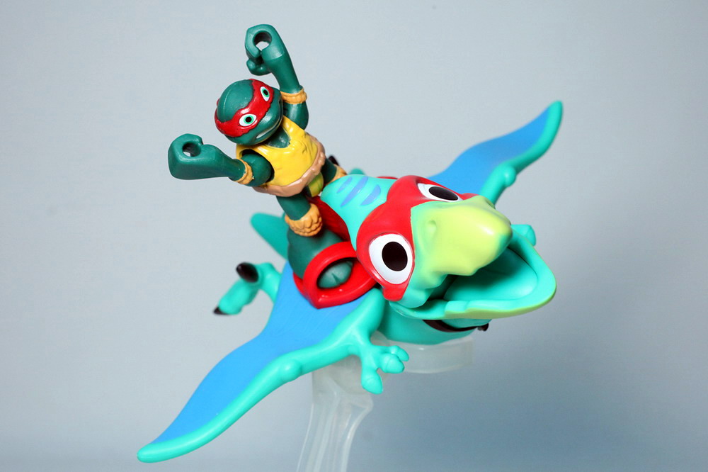 The Pterodactyl (with Raph) might be a quick favorite. Winged dinosaur toys usually cannot stand on their own but this one certainly can. His feet can be positioned in flight mode as well and an articulated jaw makes this an especially fun toy. Like the stegosaurus, there’s a seat on its back for Raphael to slide his feet into, only this one is red to match the red mask. Push a button on the back of the Pterodactyl to flap his wings. Raph is another re-release figure but like Mikey, comes without his weapons sculpted into his hands.