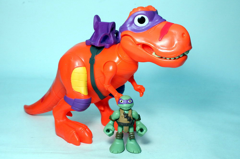 Last but not least is the T-Rex with Donnie. The much larger set gives us an impressively big dinosaur to play with. Wearing a purple mask and with a purple seat on his back, this Rex is ready to chomp down on the bad guys with a push of a button on his back.