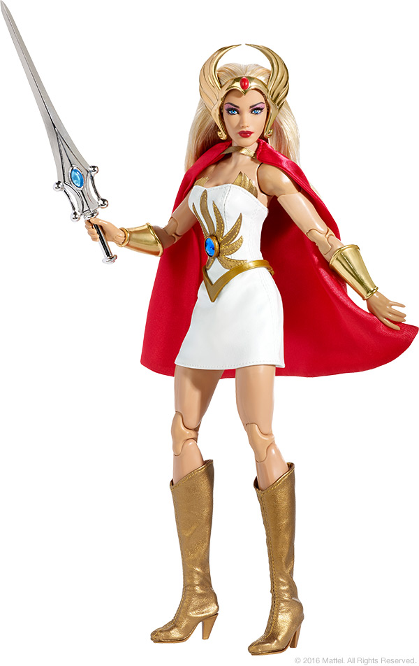 Relive the glamorous, commanding adventures of She-Ra, Princess of Power with this 11” highly detailed action figure. The Most Powerful Woman in the Universe features 24 points of articulation, rooted hair, 3 iconic fashions (please note only 1 pair of gold boots is included), 2 swords, signature shield, 6 interchangeable hands, a logo stand, and a 12-page mini comic: “The Story of She-Ra!,” and a beautiful keepsake box with vivid imagery from the enchanting worlds of Etheria and Eternia! Wage epic battle with She-Ra against the Evil Horde for the honor of Grayskull!