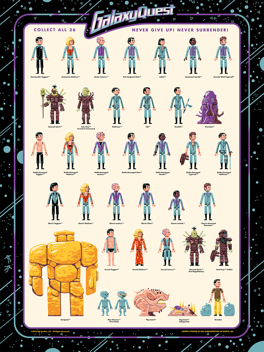 By Grabthar’s Hammer... Mondo will be selling today two fun posters for GALAXY QUEST. If somehow you've never seen this movie, Mondo recommends correcting that situation fairly quickly. The film is full of memorable characters and Andrew Kolb had the idea to design the posters featuring the crew and various alien species in the style of vintage toy packaging.