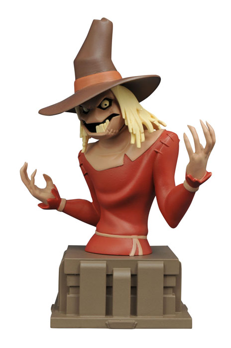 What frightens the Dark Knight? The Scarecrow knows! Thanks to the Scarecrow’s fear gas, Dr. Jonathan Crane is one of the few foes in Batman’s rogues gallery who can strike fear in the heart of the caped crusader. This approximately 6” resin bust is based on the Scarecrow’s appearance in Batman The Animated Series, and sits atop a pedestal inspired by the show’s art-deco architecture. Limited to only 3,000 pieces, it is packaged with a certificate of authenticity, and comes in a full color box. Sculpted by Varner Studios! (Item #JUN162390, SRP: $59.99)