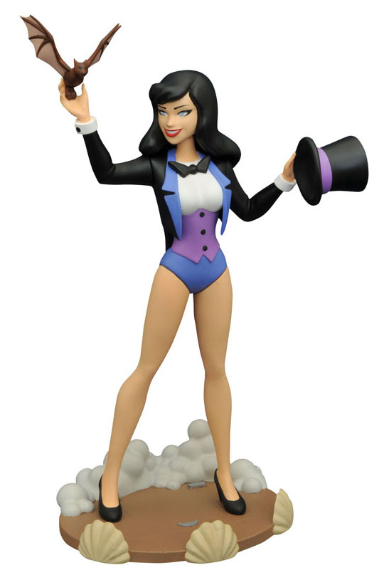 The sorceress of the DC Universe is the next DC Animated Gallery PVC figure! Based on her appearance in Batman: The Animated Series, this sculpture depicts stage magician and genuine magic-user Zatanna Zatara posed as if in the middle of a performance, on a stage base, pulling a bat out of her hat. This 9-inch scale figure is cast in PVC plastic and features high-quality paint applications, and is in scale to all Gallery and Femme Fatales figures. Packaged in a full-color window box. Sculpted by Varner Studios. (Item #JUN162389, SRP: $45.00)