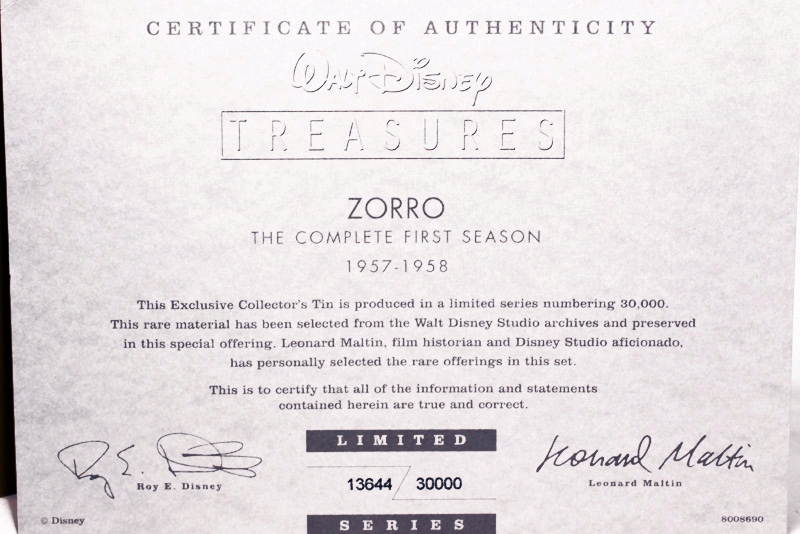 Walt Disney Treasures: Zorro – The Complete First Season 6-DVD set and Walt Disney Treasures: Zorro – The Complete Second Season 6-DVD set are now available to own on DVD. Limited edition 30,000 per set, includes exclusive Zorro pin and publicity still.