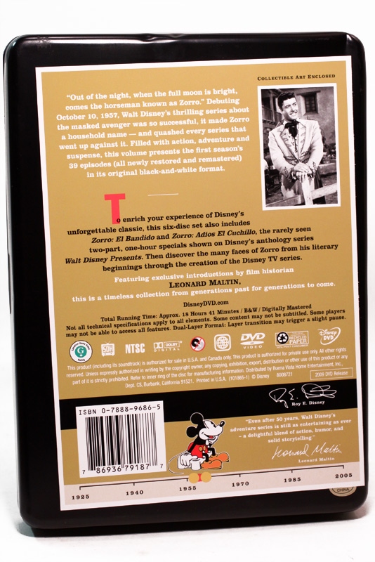 Those were the lyrics that began every episode of Walt Disney Studio’s production of ZORRO, which made its debut on ABC on October 10, 1957 and earned record viewership from families young and old for two solid seasons. These two seasons can finally be owned in their entirety on Disney DVD in a limited edition Walt Disney Treasures Tin set, limited to 30,000 sets each. Each season, sold separately, comes with Certificate of Authenticity, Zorro pin, reproduction photo from the show, and some neat bonus features.
