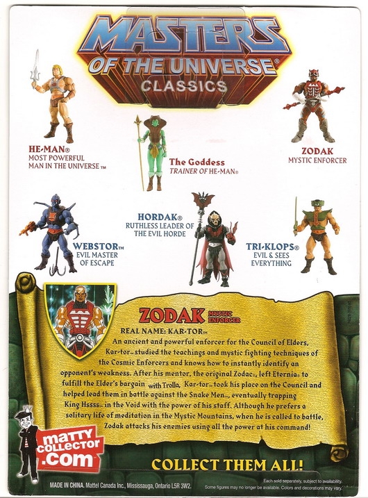 PACKAGING: Zodak comes packaged in the standard Masters of the Universe Classics blister-card packaging. The carded figure comes packed in the white mailer box which has proven to be a highly successful move by Mattel to ensure the figures are delivered in the best condition possible. The bio reveals plenty of interesting information regarding this cosmic enforcer from the 200X animated series. Zodak's bio reveals his true name Kar-Tor and shares a lot of insight into the characters background and relation with the original Zodac.