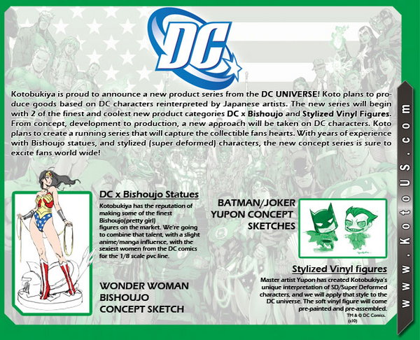 Kotobukiya is scheduled to announce various new products and licenses during the show including:The 2010 NYTF has a special significance for Koto Inc. Not only does it mark the 10-year anniversary since Kotobukiya entered the U.S. market, but it also reveals the fusion of Kotobukiya's heritage of fine craftsmanship with the profundity of the minds of U.S. collectors. All of Kotobukiya's efforts and enthusiasm in the U.S. market for the past 10 years has been brought to fruition. This is what the 2010 NYTF signifies to us.