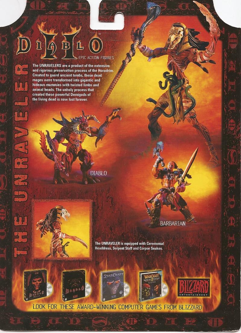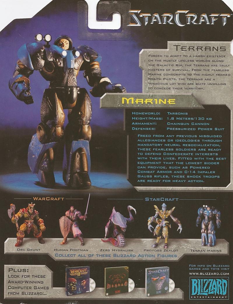 Earlier this week I showed you the Card Back for Toycom's StarCraft. Today we take a look at the line that started it all, Blizzard's own attempt at StarCraft action figures. I was not working in the toy industry at the time, so these figures totally caught me off guard when I spotted them at my local mall. As a devoted StarCraft player, I was blown away by this toy find. I have the Zerg too, but not sure what happened to his Card Back. Later on I snagged a figure each from Blizzard's WarCraft and Diablo II figure lines, both of which I've added here to give you the complete Blizzard action figure picture.