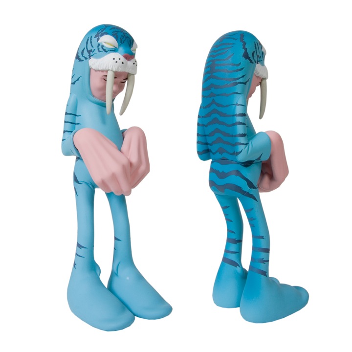 In true Flores fashion, the Wyger - combined elements of a Walrus and Tiger - is adorned with classic Sam Flores attributes; including the oversized hands and feet, as well as the blank eyes, melancholic figure posed somewhat sheepishly and self doubted in a Wyger costume.