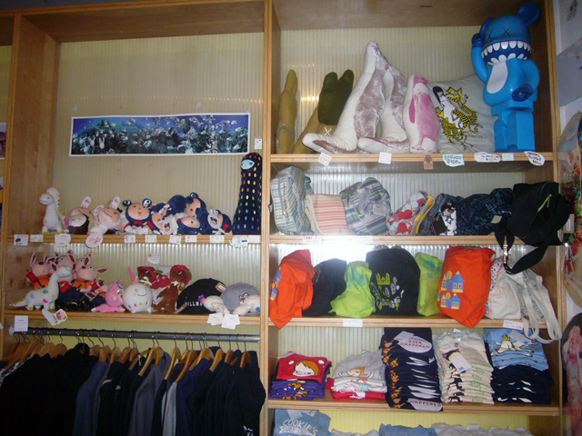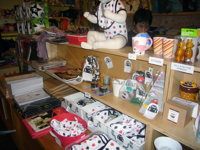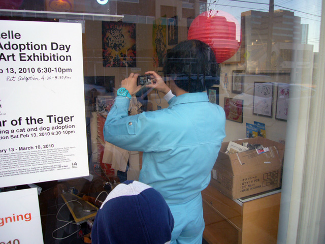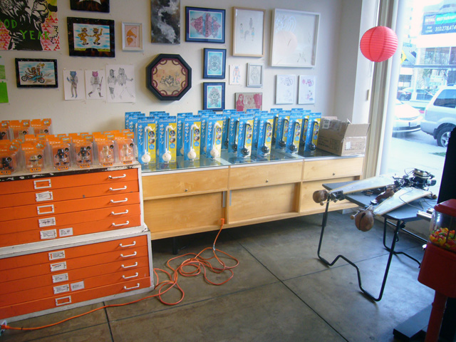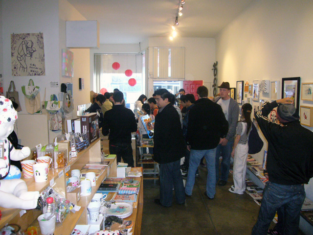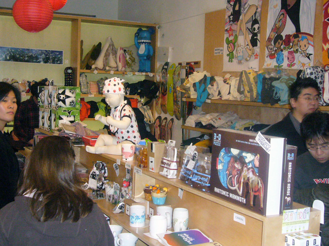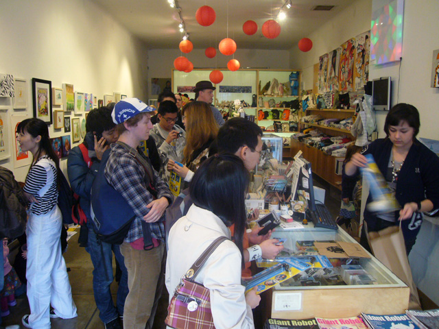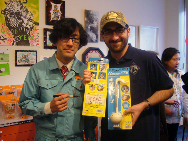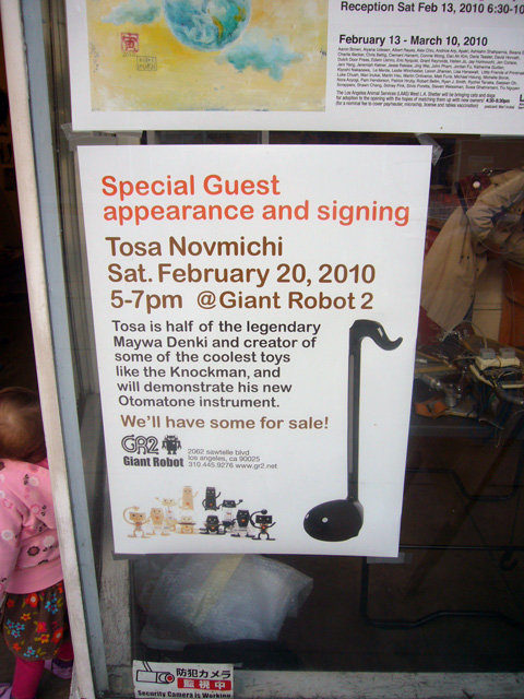 To promote the Otamatone in the United States, its creator (and one half of the Maywa Denki team) Tosa Novmichi appeared at the Giant Robot store in Santa Monica, CA. His signing actually took place in the Giant Robot's sister storefront across the street, possibly because the staff expected a small turnout. To say they were wrong is an understatement. As the event was about to start the tiny shop suddenly filled to overflowing with excited customers, all clamoring to buy their Otamatones for Novmichi to sign. Just before 5 o'clock the official sales began, and all of us eagerly snatched up our instruments for purchase. Novmichi, shy when he's not performing, stayed out of the way and actually took pictures of us as we waited an interminably long time to make our purchases!