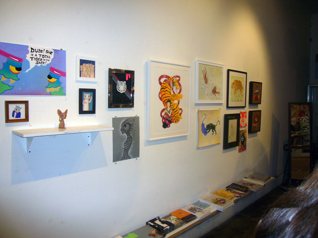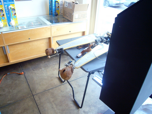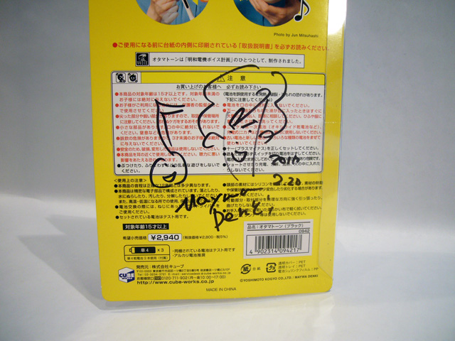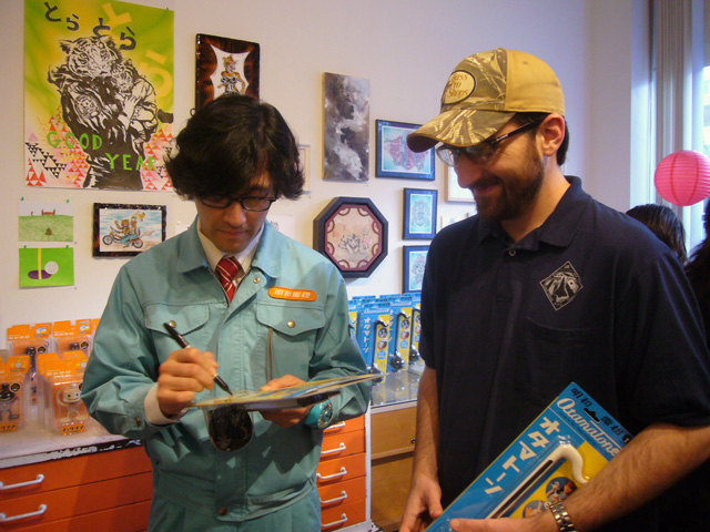 Novmichi, for his part, appeared in his usual pale blue Maywa Denki jumpsuit complete with rotary phone novelty watch and thick glasses. He was very pleased to see the enthusiastic turnout, and was more than happy to sign Otamatones and pose for pictures with the fans. His signature (which you can see the picture above) consists of a self-portrait, a smiling Otamatone, the date, and "Maywa Denki." For his performance, in addition to the Otamatone, Novmichi brought one of his unique musical inventions, the snapping percussion backpack rig. Unfortunately I was unable to stay for the entire performance, but you can catch the highlights on Giant Robot’s video of the event [ame="http://www.youtube.com/watch?v=phmIBvp7mSM"]HERE[/ame].