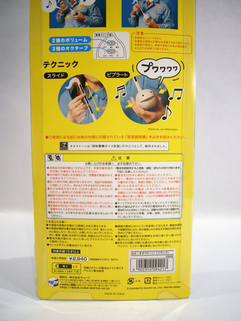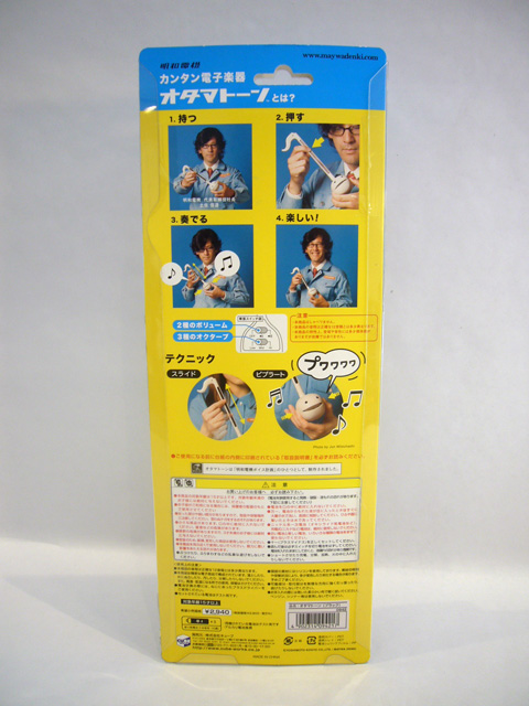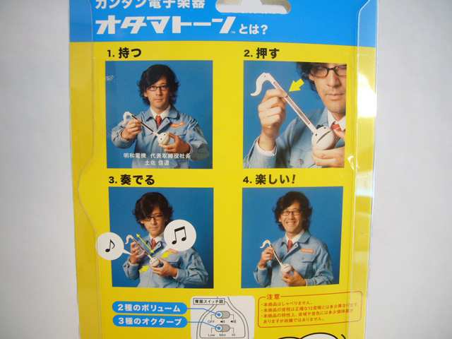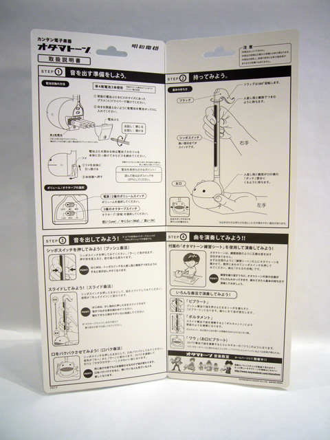 The Otamatone is packaged vertically in a sturdy plastic bubble attached to a tall cardback. Groovy blue and yellow dominate the package, and the toy's name is prominently displayed in English at the top. The back of the card has basic instructions with accompanying photos – that's the Otamatone's creator Tosa Novmichi himself! Even if you can't read Japanese, the Otamatone is easy to figure out. Inside that large card you’ll find two pages of further pictorial instructions, along with sheet music for a frog song.