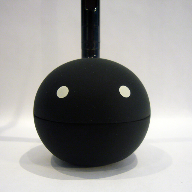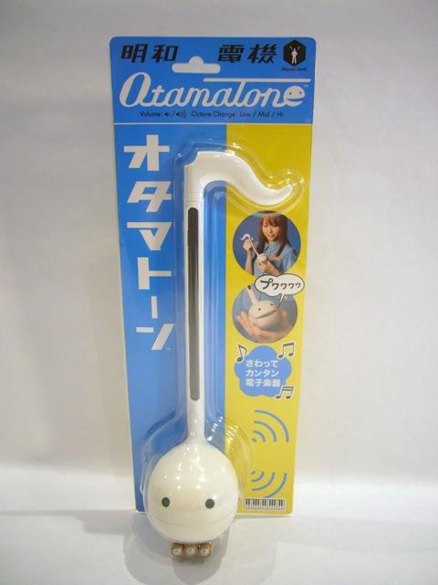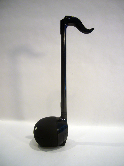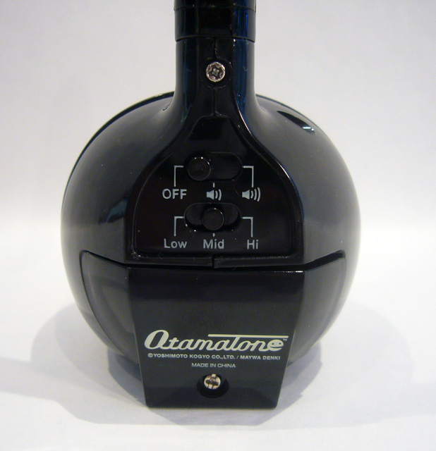 Maywa Denki's latest innovation is the Otamatone. It resembles an 11 inch tall musical note and comes in either black or white. The "tail" at the top rotates, and the bottom bulb is made of soft plastic and has two painted eyes above a horizontal slit. At the back of the base are two selective controls: volume (off/low/high) and octave (low/medium/high). That pretty much describes what it looks like, but what does it do? It plays music, of course!