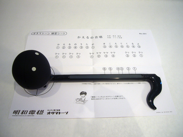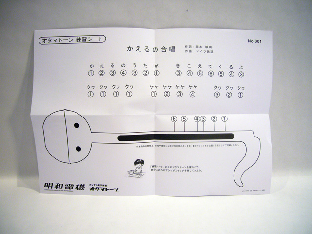 Like the slide whistle or harmonica, the Otamatone is easy to pick up and play, but difficult to master. There are no markings to designate "home keys" or specific notes, so you need to practice to be able to feel the music. To that end, the Otamatone comes with sample sheet music so you can learn a traditional Japanese frog song. Simply lay your Otamatone in the outline and play the notes as indicated. The song isn't very exciting, but you get the idea.