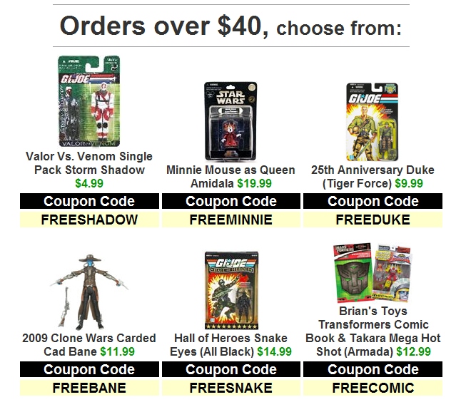 To qualify for this promotion, you must spend a specific dollar amount or more worth of in-stock merchandise between now and May 4th, 2010, and you become eligible to pick one from a list of items or figures - Absolutely FREE! Just add one of the products on the list to your cart and apply the coupon code at checkout!