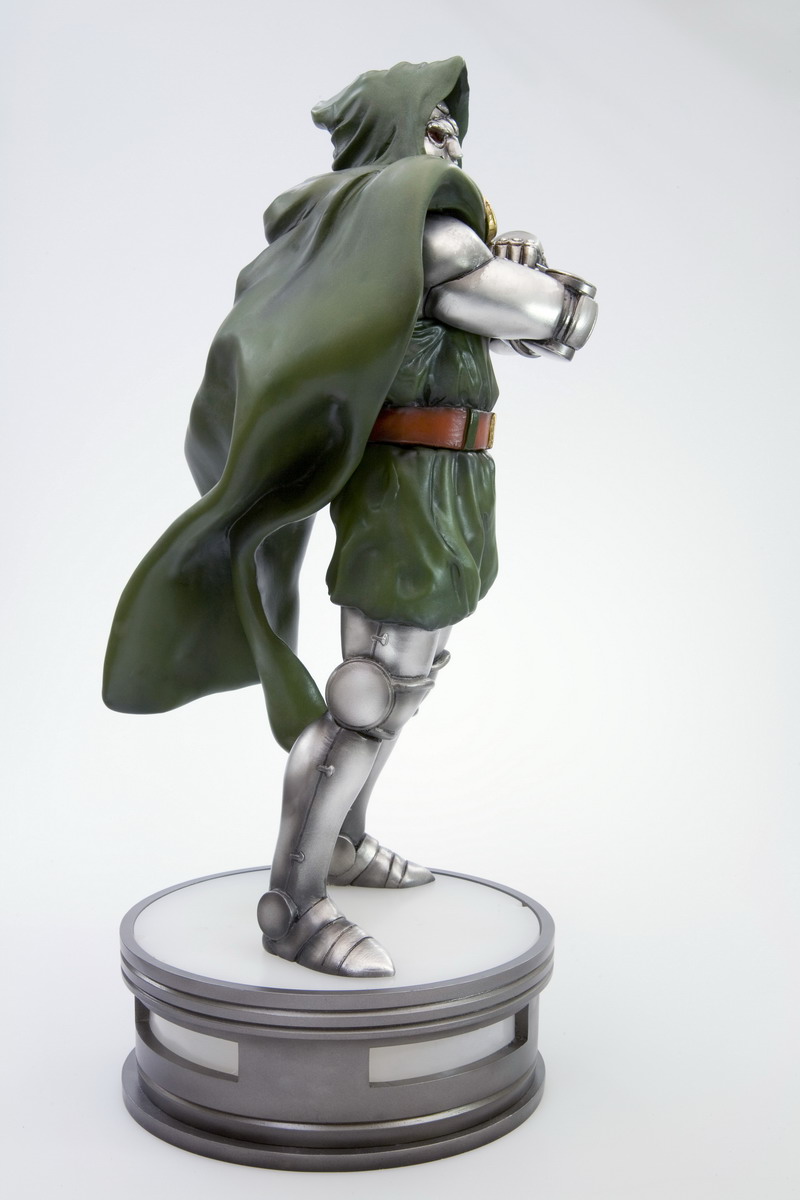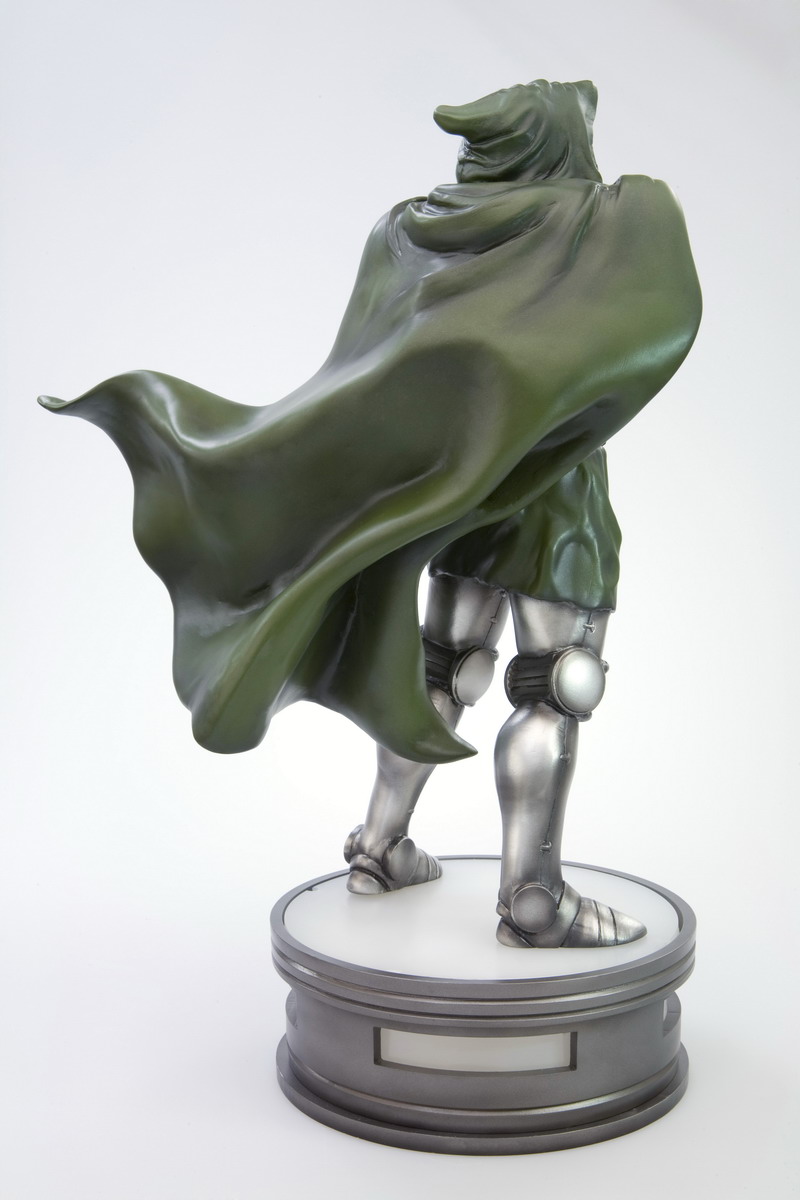 Dr. Doom measures 15 inches tall (1:6 scale). Like the other statues in the Marvel Villains line, Doom stands upon a specially-designed circular base that lights up with interior LEDs. Sculpted by Eric Sosa, a member of Kotobukiya's newly-formed "Kreative 3" Team, Dr. Doom is constructed of high-quality cold cast porcelain.