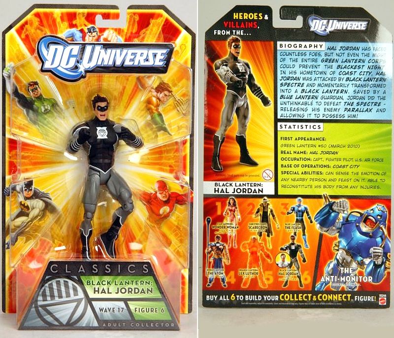 Mattel provides a packaged look at their latest assortment of DC Universe Classics: Wave 17. Themed after the Blackest Night story line, this Lantern filled series includes Indigo Lantern Atom, White and Black Lantern Hal Jordan, Blue Lantern Flash, Orange Lantern Lex Luthor, Sinestro Corps Scarecrow, and Star Sapphire Wonder Woman. Get them all to build your very own Collect-and-Connect Anti-Monitor. Look for DCUC 17 this summer.