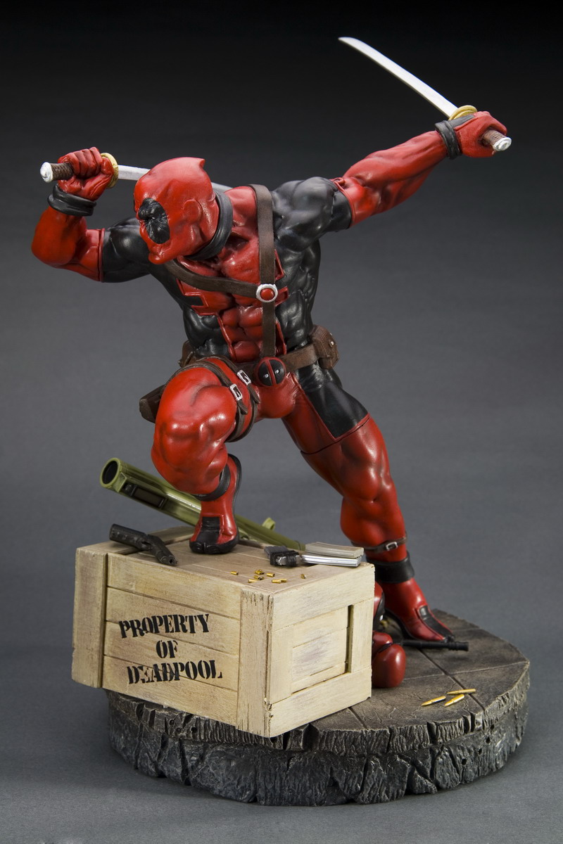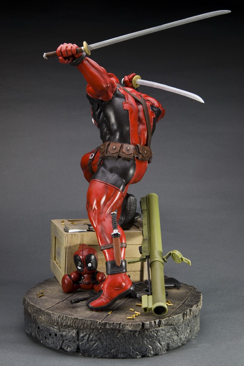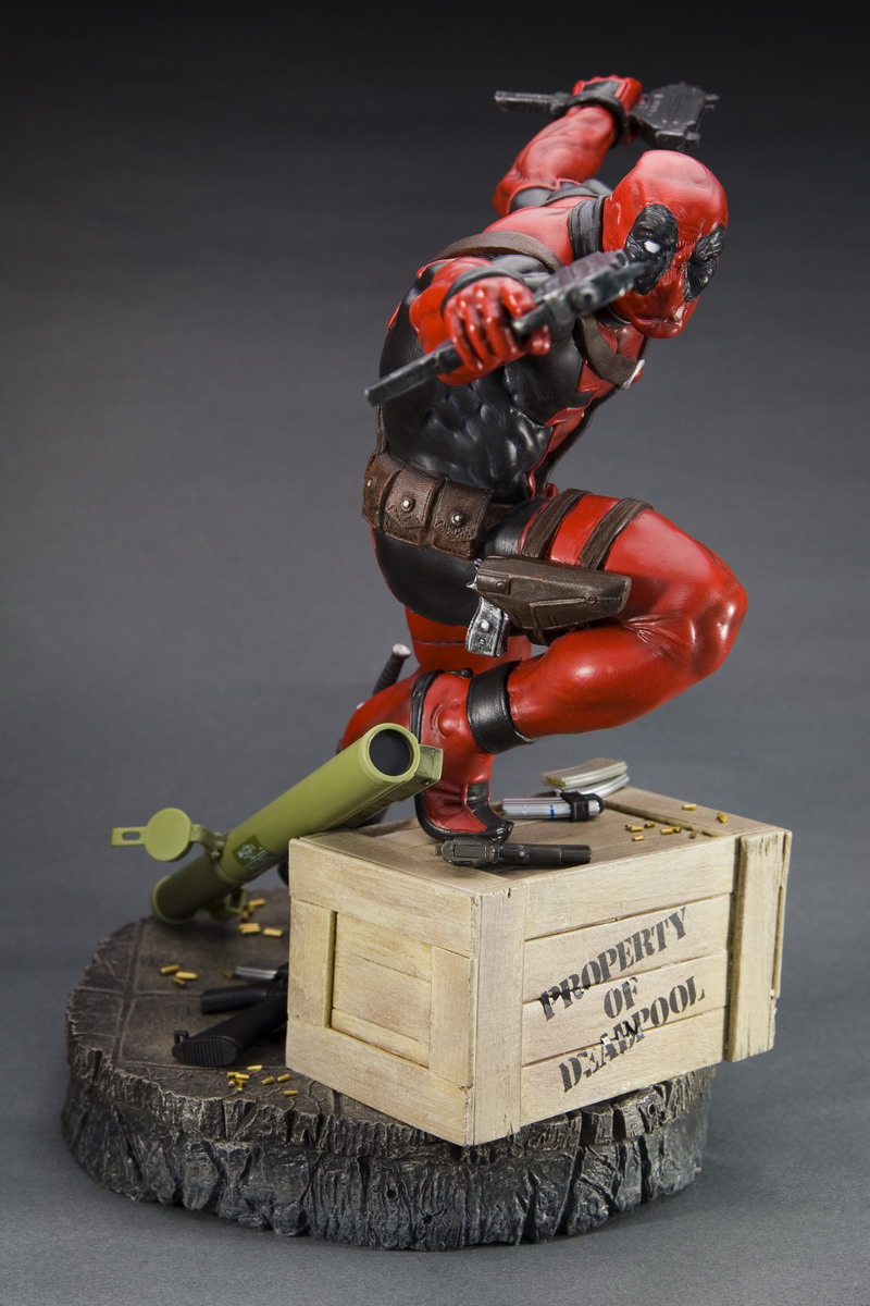 Sculpted by Erick and William Valenzuela, Deadpool stands approximately 10 inches tall, leaning over a detailed battle scene complete with crate and even a tiny Deadpool "plush" toy.