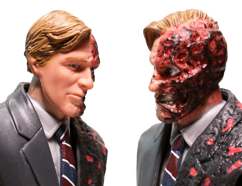 Much like the previously released Harvey Dent figure, Two-Face uses the same basic mold with the exciting twist of acid. Two-Face, like many of Mattel's figures, is sculpted by The Four Horsemen and for the scale, they did a rather nice job. It's not the most precise looking mold we've seen (thank you, Hot Toys) but it's a solid looking figure.