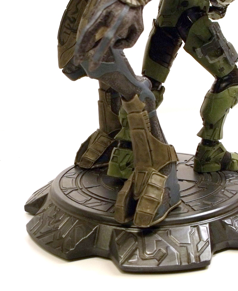 The Master Chief and Arbiter statue is anchored by a large circular base sculpted with ancient Forerunner architecture and "Halo 3" etched on the "front". Heavy and broad, the base not only provides a solid platform for the statue to rest on, but its round shape is key to the sculpture's flowing composition. You can display your statue with the Master Chief front and center, or rotate the sculpture around so the Arbiter is the star. However you turn the statue, it looks great. I plan on purchasing a revolving stand to perpetually spin my statue on display.