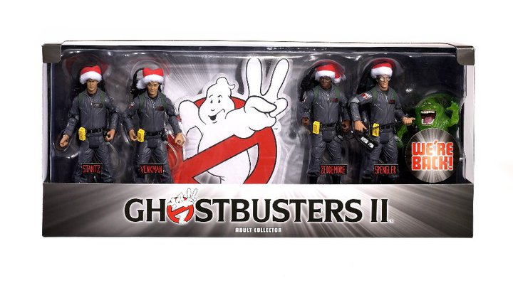 Mattel provides a look at a new Ghostbusters 2 6-inch action figure box set. This festive pack features all four Ghostbusters with removable Santa hats, Slimer and a ghost trap. This box set will be available exclusively at Toys"R"Us this holiday season.
