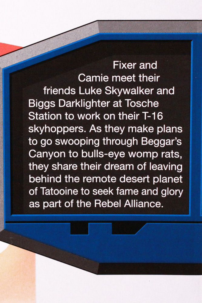 These figures don't come with much but they have it where it counts. As deleted scene figures, I couldn't imagine what they should come with. Fixer comes with a blaster, I suppose because everyone has one in that part of Tatooine. Camie comes with a pet of some kind. Hasbro calls it a dog and it does resemble a shaved poodle so we'll call it a dog too. The dog has no articulation and is sculpted to be held, not a great piece on its own. And of course there's the comic book since this is a "comic" pack.