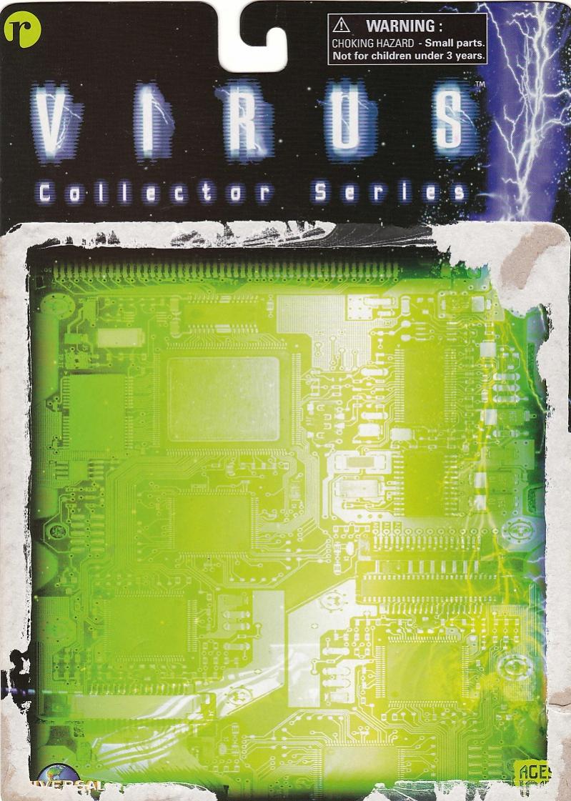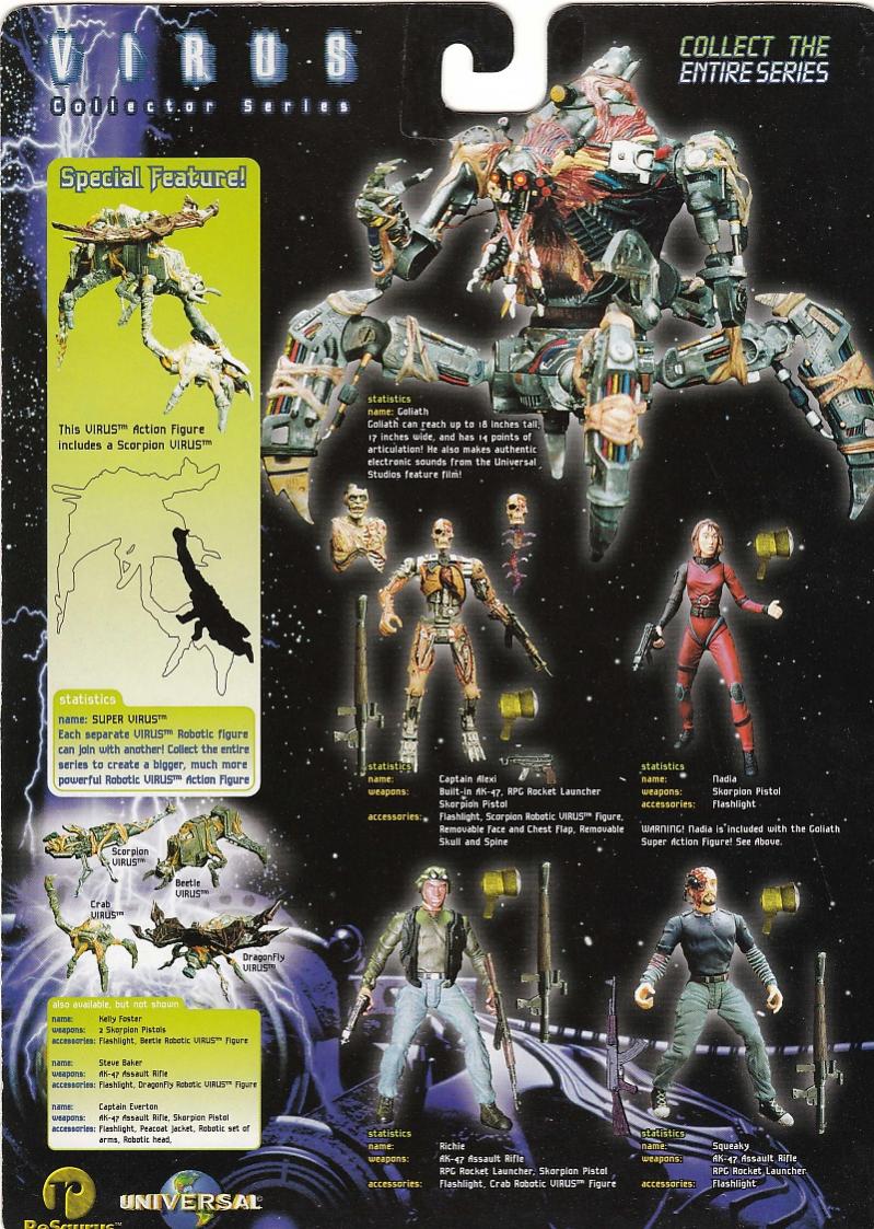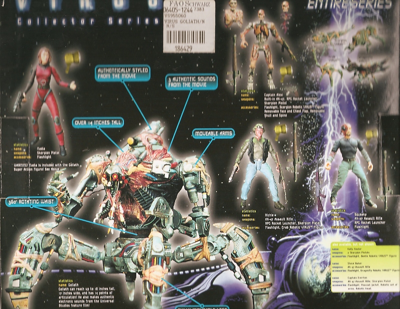 Following our Duke Nukem Card Back earlier this week, here's another little retro gem from ReSaurus: Virus. Originally slated to be a Summer 1998 release, this sci-fi film was pushed back until January 1999 - a month long regarded as a dumping ground for bad films. It certainly didn't help Virus's ticket sales, though much of the blame can be attributed to the "been there, seen it" predictability of the movie itself. It's a shame the movie tanked because the action figures ReSaurus created were quite good, especially the cyber-undead. The deluxe "Goliath" was the crowning jewel in the Virus collection - a hulking piece of twisted plastic with electronic effects. While the figures quickly became easy grabs at discount prices, the Goliath was a bit of a rariety due to the failure of the film, and subsequently the toy line. I managed to snag one at FAO Schwarz, and while not the prettiest toy ever created, it is huge and heavy and a wonderful addition to my sci-fi figure collection.