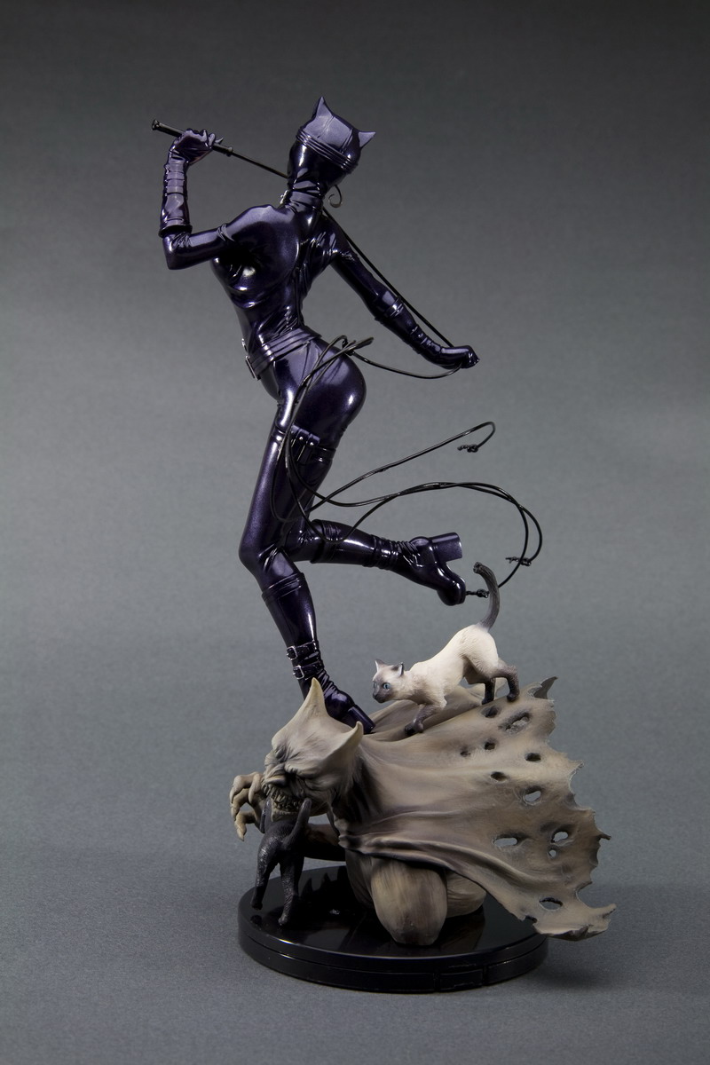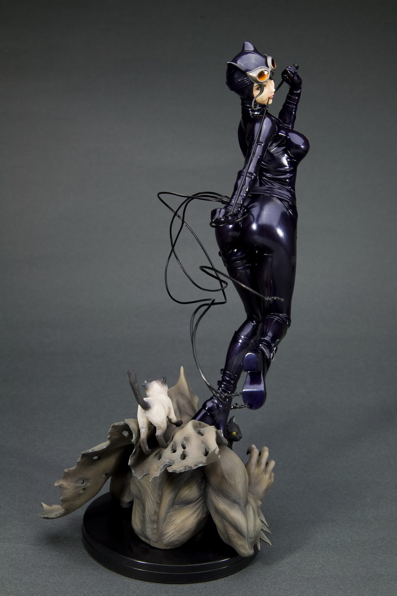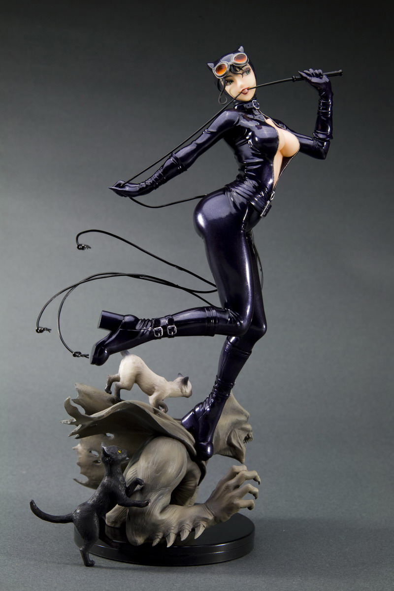 Catwoman is constructed of high-quality PVC plastic and stands approximately 9 1/10 inches tall (in an increased 1/7 scale for DC X Bishoujo statues) atop an exclusive Gotham City Batman-inspired gargoyle base complete with two miniature cats.