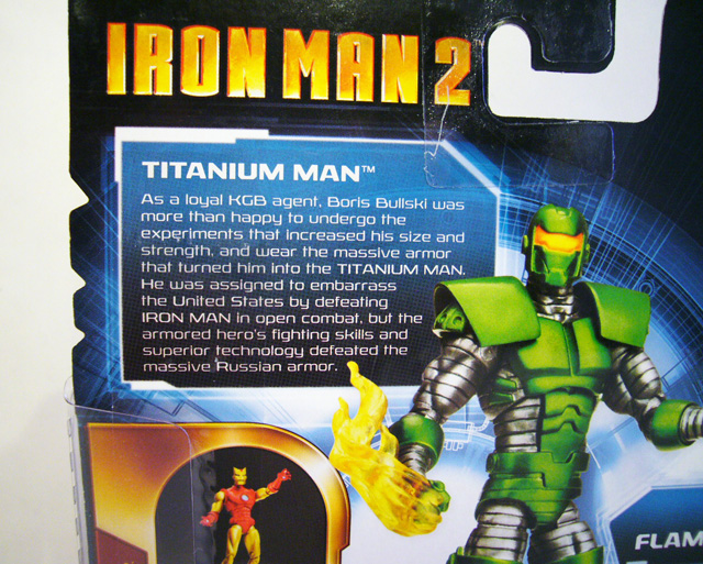 As I said, the Iron Man 2 line is chock full of Tony Stark's creations, coming out of the comics, films, and the imagination of the guys at Hasbro. What the line is light on, however, is villains. That was my first reason for giving Titanium Man a second look. He's a unique bad guy and perfect to go up against my horde of Iron Man figures. His bio describes Boris Bullski as a KGB agent who, via experiments, grew in size and strength before donning the massive Titanium armor. Of course, he couldn't beat Stark, but what villain can?