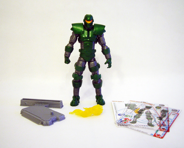 While the standard Iron Man armors are generally some combination of reds and yellows, Titanium Man stands out from the crowd with his vivid emerald green. Colors follow the different styles of armor, so the banded "undersuit" is a steely gray with the green reserved for the heavier outer pieces. The visor and energy apertures on the left palm and feet are all decorated in yellow surrounded by orange. The helmet looks great, and the addition of the energy effects on the bottom of the feet really shows the attention to detail.