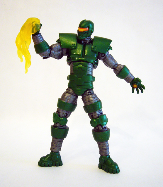 All of the Iron Man 2 figures have great articulation, and Boris is no different. He's articulated at the neck, ball-jointed shoulders, ball-jointed elbows, wrists, ball-jointed torso, ball-jointed hips, upper legs, double-jointed knees, and ball-jointed ankles. Personally, I don't care for the ball-jointed hip design, as I think it really detracts from the look of the figure. Titanium Man's shoulders are very restricted due to the heavy shoulder armor, but he can still be posed in all sorts of fun positions. Other than the usual display base and armor cards, Boris comes with a translucent yellow plastic "flame blast" accessory that fits snugly over his right fist.