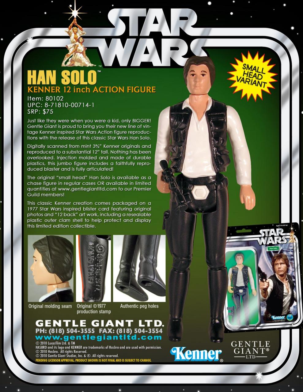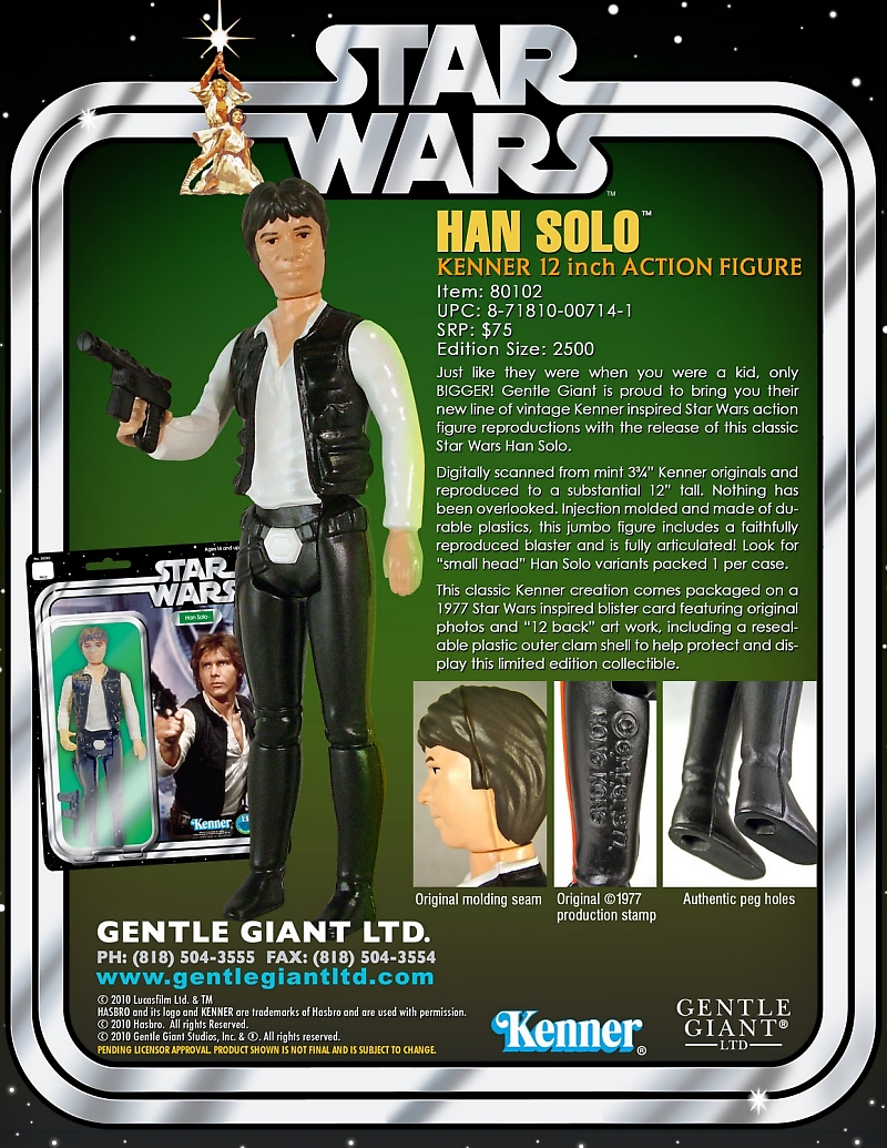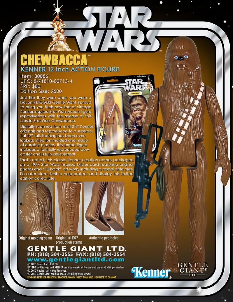 Gentle Giant reveals that the next figures in their Jumbo Vintage Star Wars Kenner line (read our story HERE) will be Chewbacca and Han Solo. Slated for release in March 2011, these faithful recreations of the 1977 originals measure 12 inches tall and include their classic blaster accessory. Chewbacca is priced at a SRP of $80 while Han Solo retails for $75. Han will see two releases: a big head version and a rare small head variant packed 1 per case.