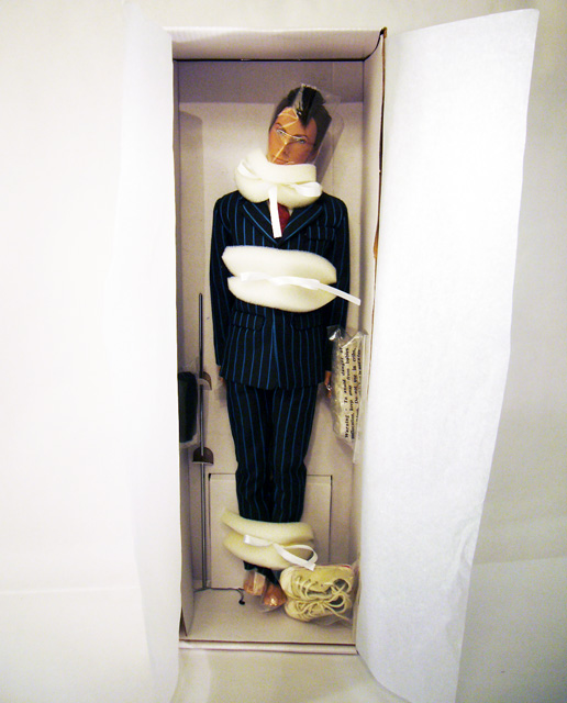 Each Tonner collectible doll comes packaged in a unique “shoebox” style carton. There’s a plain outer sleeve, but inside you’ll see a sturdy box decorated with the swirling “timey wimey” patterns of the time stream along with a prominent Doctor Who logo. Pull of the top and you unveil the doll itself, very securely bundled up. The Doctor is attached to his box by silk ties (cushioned by foam) and has plastic bags over his head, hands, and feet. Also attached safely to the box in their own plastic baggies are all of his accessories.