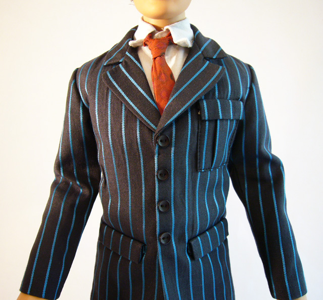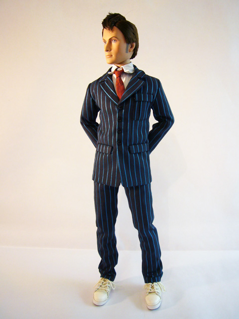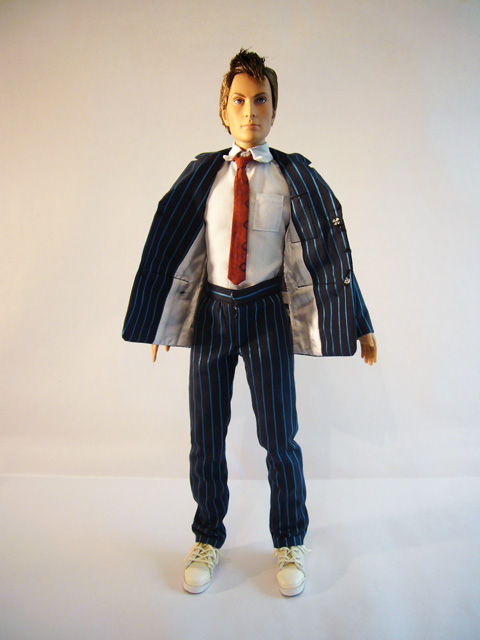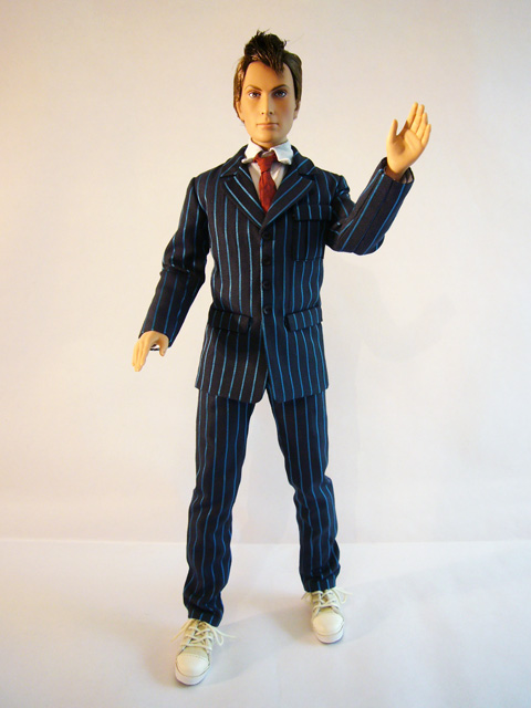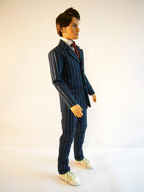 Tonner dolls are well known for their real cloth clothing, and the Doctor is a great example of this. The always dapper Time Lord wears an outfit consisting of a dark two-piece pinstripe suit, white shirt, red tie, black socks, and white and red canvas tennis shoes (known to the British as plimsoles). The detail on these items is remarkable, truly fully-functional clothing in miniature. The stitching and hems are perfect, and the pockets and snaps work! The Doctor comes packaged barefoot, so it’s up to you to slide on his socks and shoes. Then there are even shoelaces to tie to complete the picture. Other than the clothing, the Doctor has one absolutely crucial accessory, his trusty Sonic Screwdriver! Perfectly in scale with the doll, the technological gadget has both heft and a nicely detailed sculpt. If you pose him carefully the Doctor can hold the Screwdriver, and it’ll fit in any number of his pockets.