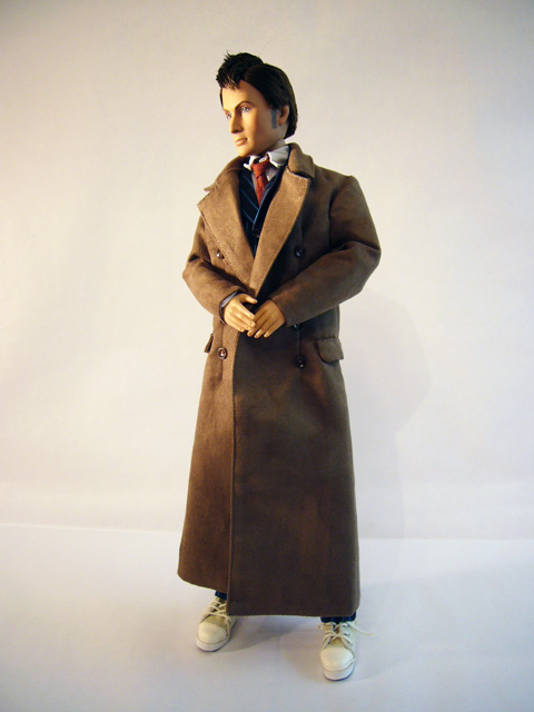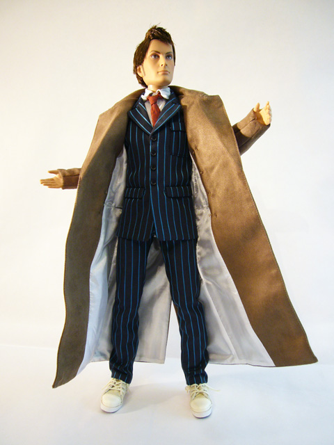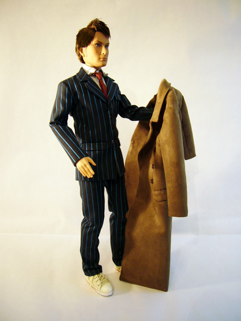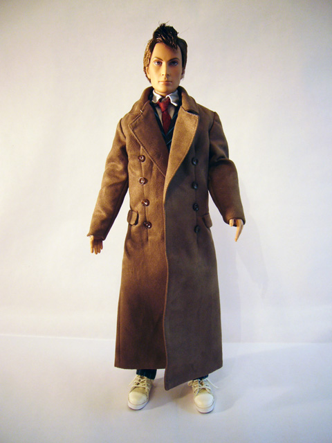 While the Tenth Doctor always wore a stylish suit, he frequently accessorized it with a great duster. You can now complete your Doctor doll with the Tonner Direct Exclusive Time Lord’s Coat! A full size faux suede duster, the coat comes packaged in a slim clear package. It’s tied to a plastic backing so that you can see it in all of its glory, and it does look very good. Obviously, it belongs on the Doctor, and thankfully it’s not too difficult to get it onto the doll. Be aware of the thumbs though; the coat has a full liner which is very cool, but it can get caught on the fingers as you’re putting it on.