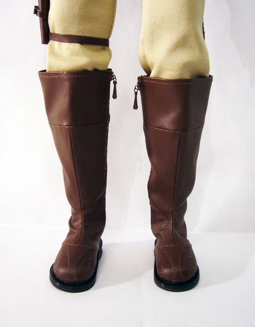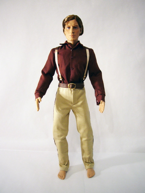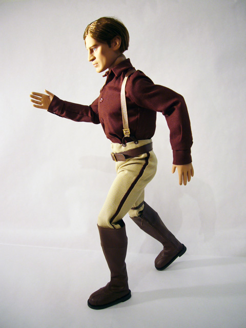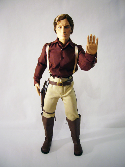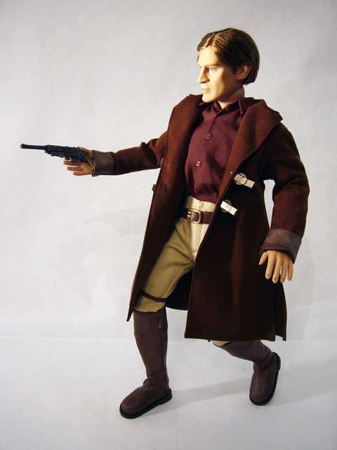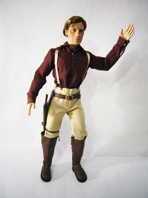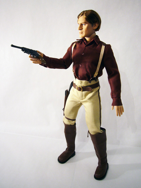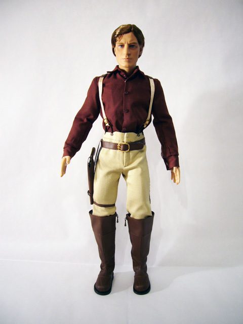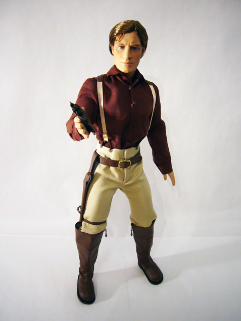 All of the Tonner dolls wear real cloth clothing, and Malcolm has quite a wardrobe. Packed in the box he wears a gold undershirt, burgundy cotton shirt, twill trousers with suspenders, and a faux leather belt. In addition, he comes with socks, faux leather zippered boots, and a faux leather gun holster. It’s a pretty simple matter of putting on his socks and zipping up the boots. The holster is a bit more complicated, as it involves unclasping Mal’s belt and finding an appropriate place on his leg to wrap around the holster’s lower strap. Once all of that is done Reynolds is ready for action. As with all of the Tonner dolls, the clothing here is covered in completely authentic details from stitching to cuffs, buttons and snaps. The last accessory is Malcolm’s trusty pistol, a “Moses Brothers Self-Defense Engine Frontier Model B.” This miniature version is a resin reproduction with a fantastically intricate sculpt. And while Reynolds can’t easily wield his sidearm due to his open hands, there are poses that still look good with him holding it, and of course it fits perfectly in its specially designed holster.