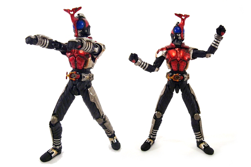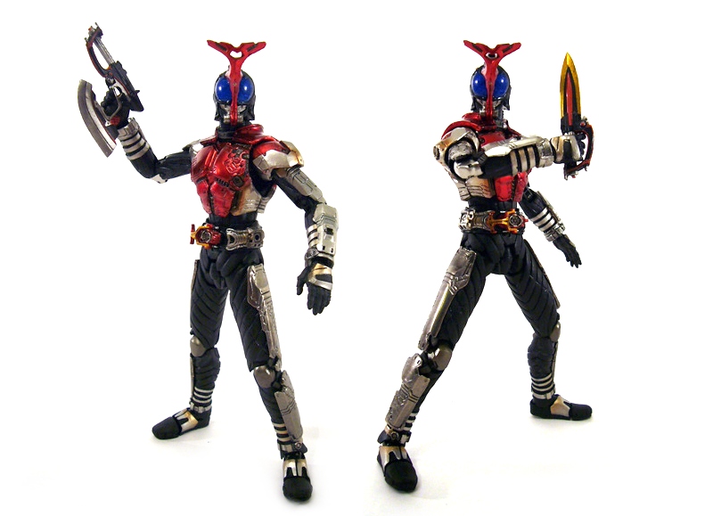 Without delving too far into the Kamen Rider mythology, each hero has various forms and specific equipment for each. It’s just so with Kabuto, whose basic form wields a dagger and a gun that transforms into an axe. Swapping out a couple of parts turns him into his “Decade” version that also has its own weapon: a sword/gun/book. This form’s belt is much smoother with a large silver “buckle” decorated with red spheres. The alternate head (that’s used in most of the other forms as well) is an upgrade with green “eyes” and larger horn, which is easy to replace on the neck ball joint.