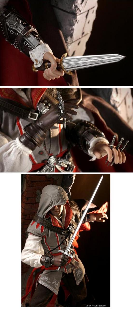 Ezio, as an assassin without peer, comes armed and ready to work. Weapons include a long sword, a short broad sword, six throwing daggers, and his trademark hidden blades (above/below).