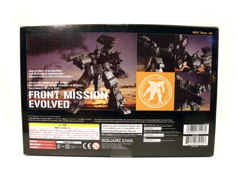 PACKAGING: Like all Play Arts Kai, the Front Mission Evolved figures ship in a closed window box offering a great look at the toy inside. What's different is the horizontal way these are displayed: figure packed on the right with all its gear gear stowed on the left. Each box shares the Front Mission logo - the silhouette of a wanzer - and some stylish splash "damage". Colored bars and text - orange for Enyo, blue for Zenith, etc. - add some personality to each mech, as do the sides and back panels, the latter of which depicts the figure in several dynamic action poses.