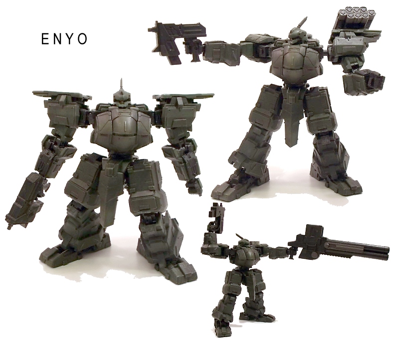 ARTICULATION: Another Kai trait, the three wanzers star an abundance of articulation. The points are almost too numerous to count, but here is a quick run down: swivel head, swivel upper forearms and waist, ball wrists and a slew of hinged/swivel/ball-like joints in the shoulders, elbows, thighs and feet. Some, like the Zenith, even features a jetpack with rotating thrusters. Of the three, the Enyo was the most enjoyable to pose and play with due to his nice and tight joints. Unfortuantely, the Zenith and the Zephyr suffered from a case of slightly loose limbs. It's not extremely terrible, but the elbow joints were just loose enough to equal frustrating when trying to strike particular gun-firing poses (especially when firing the big honkin' bazooka and long rifle). There are some toy tricks - like working superglue into the joint - to fix this issue, but I found myself wishing these had the tight ratchet joints like the Halo:Reach Kai.