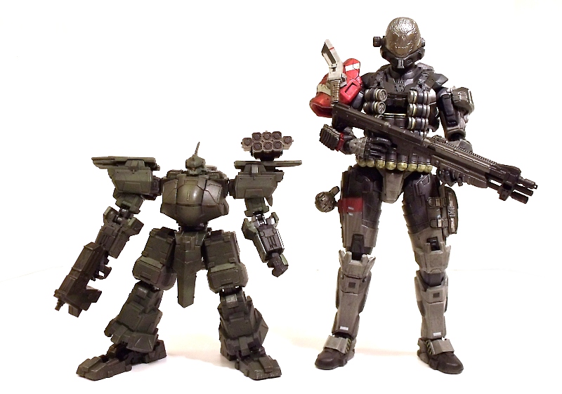 First, a small word of warning: the larger size often associated with Kai isn't here this time - these figures measure about 5-6 inches tall as opposed to 8-9 inches. These new Front Mission Evolved collectibles are hyper-articulated and detailed like Kai, but fans going in expecting a huge figure are going to be in for a surprise. 5-6 inches tall is still a pretty good size and they pack some mass: stout and robust. Even better news is that these are darn close to the same scale as Kotobukiya's older Front Mission figures, perfect for play and display.